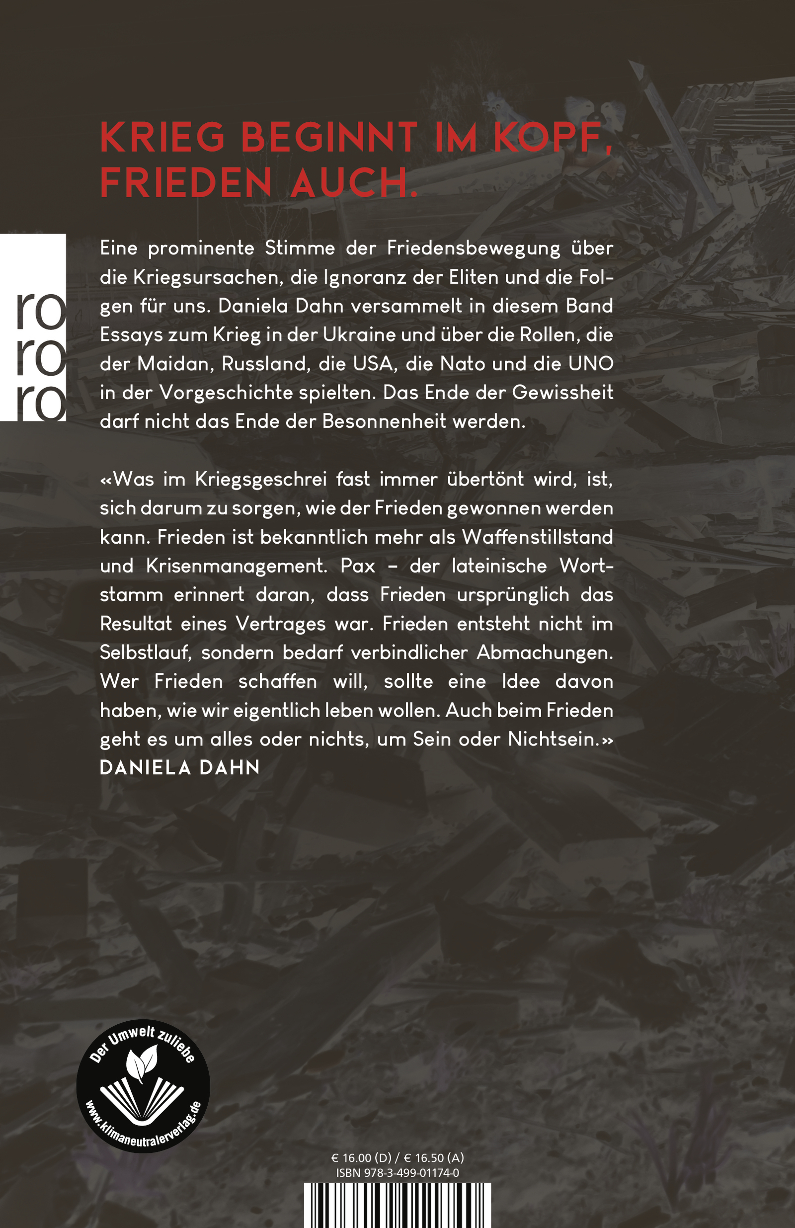 Börne-Preisträgerin Daniela Dahn präsentiert neue Texte zum Krieg in der Ukraine und solche aus der unmittelbaren Zeit davor: über seine Vorgeschichte, den Maidan, die russischen und die westlichen Positionen. Sie zeigt, dass der Westen Teil des Problems ist und die UNO gestärkt werden muss. Und sie wendet sich gegen Denkverbote: «Wer den Opfern helfen will, sollte die Genesis von Krisen und Kriegen zur Kenntnis nehmen.»