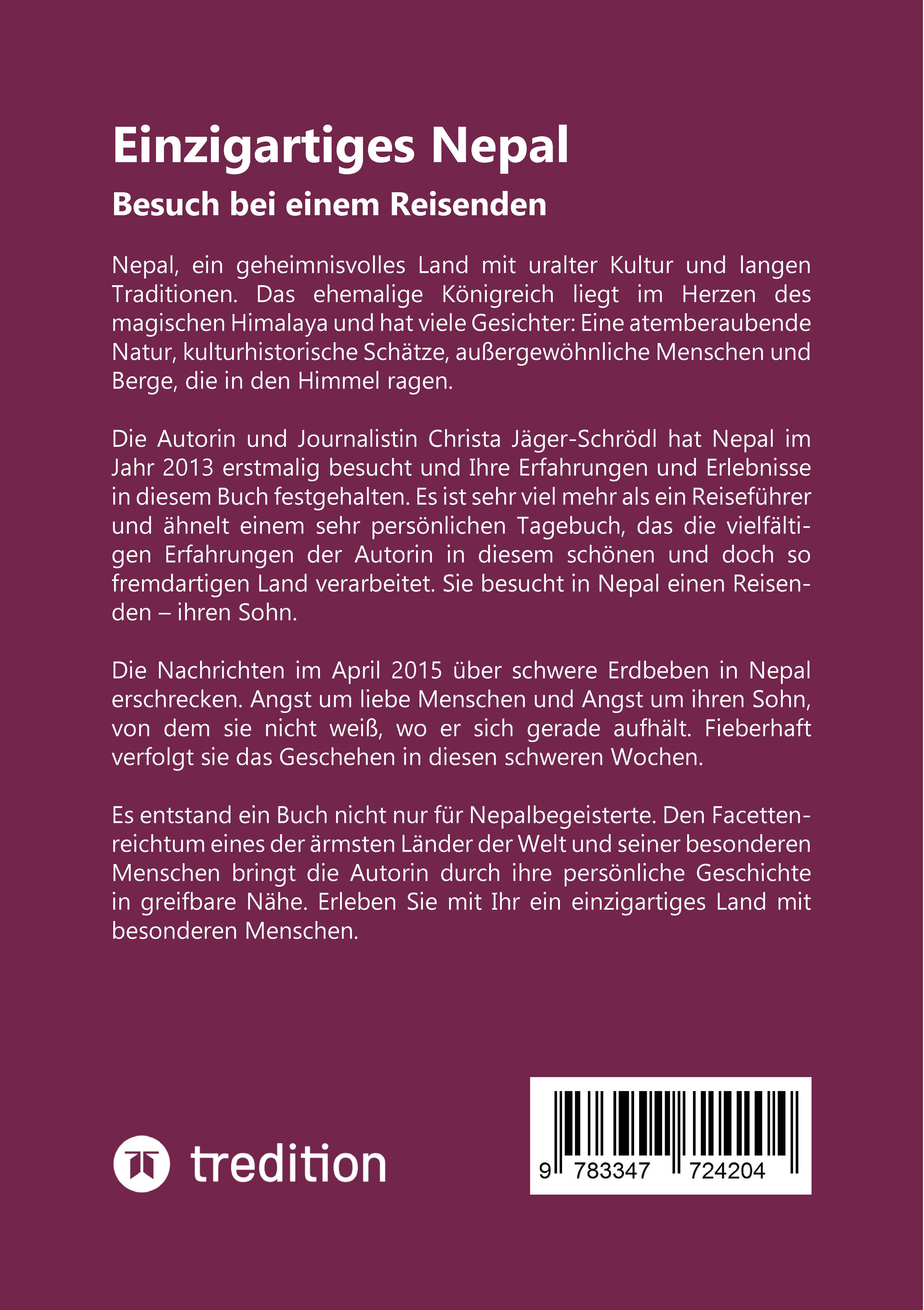 Die Geschichte:Die Autorin und Journalistin Christa Jäger-Schrödl hat Nepal im Jahr 2013 erstmalig besucht und Ihre Erfahrungen und Erlebnisse in diesem Buch festgehalten. Es ist sehr viel mehr als ein Reiseführer und ähnelt einem sehr persönlichen Tagebuch, das die vielfältigen Erfahrungen der Autorin in diesem schönen und doch so fremdartigen Land verarbeitet. Ganz beiläufig erzählt sie die berührende Geschichte zwischen Mutter und Sohn.Nach seinem Studium an der Fernsehakademie in München war es Christas Sohn Alexander nicht möglich, in der deutschen Filmbranche einen bezahlten Job zu finden. Man wollte ihn lediglich als unbezahlten Volontär für ein Jahr einstellen. Die berufliche Aussichtslosigkeit und die Trennung von seiner Frau machten Alexander zu schaffen. Der Rat, erst einmal zu sich zu kommen und dann in Asien nach Jobs zu suchen, um Berufserfahrung nachweisen zu können - kam von seiner Mutter. Schließlich habe Indien die größte Filmindustrie und Alexander macht sich tatsächlich auf den Weg. Er startet dieses Abenteuer in einem berühmten buddhistischen Kloster in Kathmandu.Das Buch beginnt mit einer eindrucksvollen Reise durch Nepal, anlässlich des Geburtstages ihres Sohnes: Von der Landung der Autorin in Kathmandu, einem abenteuerlichen Flug über den magischen Himalaya, bis zum Besuch in Pokhara, "der Stadt der Hippies", wie man sie früher nannte. Die Autorin bringt den Facettenreichtum dieser Reise durch ihre persönliche Geschichte in greifbare Nähe.Sie erzählt aber auch über einzelne Stationen und Erlebnisse Ihres Sohnes auf seinem weiteren Weg durch Asien. Die Nachrichten im April 2015 über schwere Erdbeben in Nepal machen der Mutter große Angst. Angst um liebe Menschen und Angst um ihren Sohn, von dem sie nicht weiß, wo er sich gerade aufhält. Fieberhaft verfolgt sie das Geschehen in diesen Wochen. Es entstand ein Buch nicht nur für Nepalbegeisterte. Entdecken Sie ganz neue Perspektiven eines traumhaften Landes und seiner besonderen Menschen. Die Geschichten werden durch die einzigartigen Bilder erlebbar. Lassen Sie sich von einer fremden Kultur verzaubern.Nepal, ein geheimnisvolles Land mit uralter Kultur und langen Traditionen. Das ehemalige Königreich liegt im Herzen des magischen Himalaya und hat viele Gesichter: Eine atemberaubende Natur, kulturhistorische Schätze, außergewöhnliche Menschen und Berge, die in den Himmel ragen. Das kleine Land liegt zwischen den konkurrierenden Nationen China und Indien mit Ihren Milliarden zählenden Bevölkerungen. Schon in den sechziger und siebziger Jahren des letzten Jahrhunderts übte das Land eine Faszination auf alle aus, die sich für fernöstlich Kultur und ihre Religionen interessierten. So ist es auch nicht verwunderlich, dass Nepal und vor allem seine Hauptstadt Kathmandu und Pokhara, die Stadt am Phewasee, zum festen Bestandteil des Hippie-Trail gehörten. Heerscharen von Reisenden auf der Suche nach Erleuchtung, dem Glück oder was auch immer reisten nach Nepal.Und auch 50 Jahre später hat Nepal nichts von seiner Anziehungskraft verloren. Die spektakulären Landschaften machen es zu einem Paradies für Trekkingfreunde. Überall treffen die Moderne und uralte Kulturen aufeinander. Etwas ganz Besonderes ist aber die natürliche Offenheit und der Sanftmut der Menschen dort, das berührt jeden Besucher und hat die Autorin nachhaltig beeindruckt.