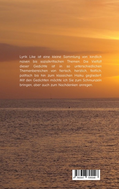 Lyrik Like ist eine kleine Sammlung von kindlich naiven bis sozialkritischen Themen. Die Vielfalt dieser Gedichte ist in so unterschiedlichen Themenbereichen von tierisch, herzlich, festlich, politisch bis hin zum klassischen Haiku gegliedert. Mit den Gedichten möchte ich Sie zum Schmunzeln bringen, aber auch zum Nachdenken anregen.