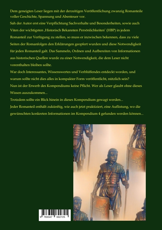 Dem geneigten Leser liegen mit der derzeitigen Veröffentlichung zwanzig Romanteile voller Geschichte, Spannung und Abenteuer vor. Sah der Autor erst eine Verpflichtung Sachverhalte und Besonderheiten, sowie auch Viten der wichtigsten 'Historisch Bekannten Persönlichkeiten' (HBP) in jedem Romanteil zur Verfügung zu stellen, so muss er inzwischen bekennen, dass zu viele Seiten der Romanfolgen den Erklärungen geopfert wurden und diese Notwendigkeit für jeden Romanteil galt. Das Sammeln, Ordnen und Aufbereiten von Informationen aus historischen Quellen wurde zu einer Notwendigkeit, die dem Leser nicht vorenthalten bleiben sollte. War doch Interessantes, Wissenswertes und Verblüffendes entdeckt worden, und warum sollte nicht dies alles in kompakter Form veröffentlicht, nützlich sein?Nun ist der Erwerb des Kompendiums keine Pflicht. Wer als Leser glaubt ohne dieses Wissen auskommen zu können... Trotzdem sollte ein Blick hinein in dieses Kompendium gewagt werden. Jeder Romanteil enthält zukünftig, wie auch jetzt praktiziert, eine Auflistung, wo die gewünschten konkreten Informationen im jeweiligen Kompendium gefunden werden können...Das 'Kompendium 4' benennt im 'PERSONENREGISTER' alle inzwischen handelnden Personen in einer Kurzvita; 'WORTREGISTER' bisherige Erklärung aller Begriffe in kompakter Form; 'LEGIONENREGISTER' die Kurz-Vita aller Legionen Roms 'REGISTER ALA & COHORS' eine Kurz-Vita bisher beteiligter Auxiliartruppen;bietet darüber hinaus mit der Übersicht über 'MILITÄRAKTIONEN ROMS 67 bis 70 AD' eine Auflistung der wichtigsten Ereignisse militärisch-politischer Art; 'LEGATUS LEGIONIS 67 bis 70 AD' eine Übersicht der Legaten Roms.Weit über 450 handelnde Personen, davon über die Hälfte 'Historisch Bekannter Persönlichkeiten' (HBP) und über 1.700 erklärte Begriffe forderten bisher in den Romanteilen bei im Maximum bis zu 116 in diesem jeweiligen Teil handelnden Personen allein bis zu 7 Seiten für deren Erklärung; bei im Maximum bis zu 319 Worterklärungen bis zu 22 Seiten für einen Romanteil.Die sich daraus ergebende Summe an Seiten reicht für zumindest zwei weitere Kapitel der Handlung oder aber für eine Preissenkung. Also suchte der Autor nach einem Ausweg, den er gefunden zu haben glaubt. Der Autor darf noch darauf aufmerksam machen dass mit der Auflistung von 30 Legionen nahezu Vollständigkeit erreicht wird; dass das Register der Auxiliartruppen auf bisher verwendete Truppenteile beschränkt wurde;. (Trotzdem verfügt der Autor über eine Bearbeitung von weiteren zumindest etwa 60 Truppenteilen (ALA & COHORS), die in Reserve für die weitere Einbindung in die Handlung zur Verfügung stehen. Eine letzte Bemerkung soll der Auflistung der Legaten gelten. Es gibt keine vollständigen Listen darüber, wer, wann und wo Legat einer Legion war, ganz besonders nicht vor den Kaisern der Flavier, Kaiser Traian oder Hadrian. Aber auch nach deren Herrschaft sind Überlieferungen lückenhaft. Der Autor verfügte bei seiner Bearbeitung über umfangreiche Literatur und war trotzdem veranlasst, manche sich ergebende Lücke aufzufüllen. Erklärungen dazu enthält der Vorspann zum 'REGISTER ALA & COHORS'.
