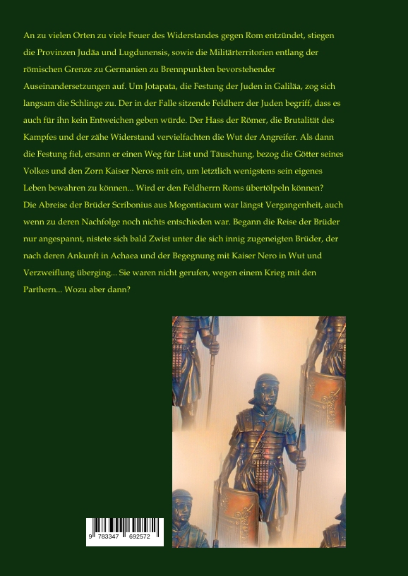 An zu vielen Orten zu viele Feuer des Widerstandes gegen Rom entzündet, stiegen die Provinzen Judäa und Lugdunensis, sowie die Militärterritorien entlang der römischen Grenze zu Germanien zu Brennpunkten bevorstehender Auseinandersetzungen auf. Um Jotapata, die Festung der Juden in Galiläa, zog sich langsam die Schlinge zu. Der in der Falle sitzende Feldherr der Juden begriff, dass es auch für ihn kein Entweichen geben würde. Der Hass der Römer, die Brutalität des Kampfes und der zähe Widerstand vervielfachten die Wut der Angreifer. Als dann die Festung fiel, ersann er einen Weg für List und Täuschung, bezog die Götter seines Volkes und den Zorn Kaiser Neros mit ein, um letztlich wenigstens sein eigenes Leben bewahren zu können... Wird er den Feldherrn Roms übertölpeln können? Die Abreise der Brüder Scribonius aus Mogontiacum war längst Vergangenheit, auch wenn zu deren Nachfolge noch nichts entschieden war. Begann die Reise der Brüder nur angespannt, nistete sich bald Zwist unter die sich innig zugeneigten Brüder, der nach deren Ankunft in Achaea und der Begegnung mit Kaiser Nero in Wut und Verzweiflung überging... Sie waren nicht gerufen, wegen einem Krieg mit den Parthern... Wozu aber dann?Verginius Rufus trug sich inzwischen mit der Hoffnung auf eine Ernennung zum Statthalter im Exercitus Germania Superior. Bis sich auch in Mogontiacum die Ereignisse überstürzten... Zuerst tauchte ein Bote der Prätorianer auf und erweckte eine alte Bedrohung. Dann kündigte dieser die Ankunft eines Konsuls Roms an.... Diese Ankunft schien in Verginius Rufus Hoffnungen zu passen, nicht ohne Grund vermutete er in diesem Konsul einen kaiserlichen Boten.. Die Urkunde zur Ernennung zum Legatus Augusti pro Praetore erhalten, überschattete ein Ereignis die Zukunft und eine neue Feindschaft wurde geboren. Eine Herausforderung der ruchlosen Art schuf neue Spannungen... Fonteius Capito, der neue Machthaber im Exercitus Germania Inferior, versäumte es nicht, sich den Zorn eines anderen Legat zuzuziehen. So entstand neuer Zündstoff am Rhenus. In Lugdunum, der römischen Stadt am Rhodanus, traf Statthalter Vindex, nach der Rückkehr von seiner Reise durch die ihm überantwortete Provinz, unvermittelt auf sein Weib. Frau und Tochter, nach einer gewagten Reise glücklich in Lugdunum angekommen, verweigerten anfangs die Auskunft zu deren Erlebnissen. So nisteten sich neue Sorgen ein und führten nicht nur zur Verstörung...
