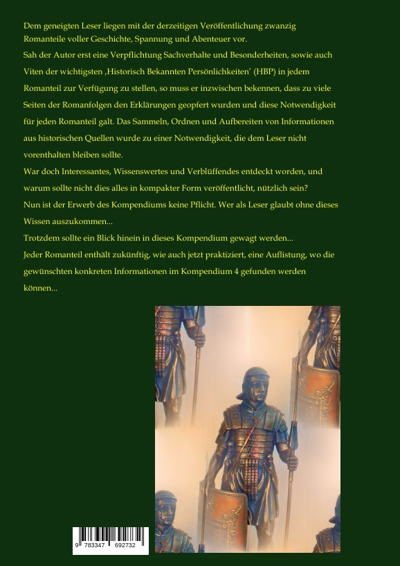 Dem geneigten Leser liegen mit der derzeitigen Veröffentlichung zwanzig Romanteile voller Geschichte, Spannung und Abenteuer vor. Sah der Autor erst eine Verpflichtung Sachverhalte und Besonderheiten, sowie auch Viten der wichtigsten 'Historisch Bekannten Persönlichkeiten' (HBP) in jedem Romanteil zur Verfügung zu stellen, so muss er inzwischen bekennen, dass zu viele Seiten der Romanfolgen den Erklärungen geopfert wurden und diese Notwendigkeit für jeden Romanteil galt. Das Sammeln, Ordnen und Aufbereiten von Informationen aus historischen Quellen wurde zu einer Notwendigkeit, die dem Leser nicht vorenthalten bleiben sollte. War doch Interessantes, Wissenswertes und Verblüffendes entdeckt worden, und warum sollte nicht dies alles in kompakter Form veröffentlicht, nützlich sein?Nun ist der Erwerb des Kompendiums keine Pflicht. Wer als Leser glaubt ohne dieses Wissen auskommen zu können... Trotzdem sollte ein Blick hinein in dieses Kompendium gewagt werden. Jeder Romanteil enthält zukünftig, wie auch jetzt praktiziert, eine Auflistung, wo die gewünschten konkreten Informationen im jeweiligen Kompendium gefunden werden können...Das 'Kompendium 4' benennt im 'PERSONENREGISTER' alle inzwischen handelnden Personen in einer Kurzvita; 'WORTREGISTER' bisherige Erklärung aller Begriffe in kompakter Form; 'LEGIONENREGISTER' die Kurz-Vita aller Legionen Roms 'REGISTER ALA & COHORS' eine Kurz-Vita bisher beteiligter Auxiliartruppen;bietet darüber hinaus mit der Übersicht über 'MILITÄRAKTIONEN ROMS 67 bis 70 AD' eine Auflistung der wichtigsten Ereignisse militärisch-politischer Art; 'LEGATUS LEGIONIS 67 bis 70 AD' eine Übersicht der Legaten Roms.Weit über 450 handelnde Personen, davon über die Hälfte 'Historisch Bekannter Persönlichkeiten' (HBP) und über 1.700 erklärte Begriffe forderten bisher in den Romanteilen bei im Maximum bis zu 116 in diesem jeweiligen Teil handelnden Personen allein bis zu 7 Seiten für deren Erklärung; bei im Maximum bis zu 319 Worterklärungen bis zu 22 Seiten für einen Romanteil.Die sich daraus ergebende Summe an Seiten reicht für zumindest zwei weitere Kapitel der Handlung oder aber für eine Preissenkung. Also suchte der Autor nach einem Ausweg, den er gefunden zu haben glaubt. Der Autor darf noch darauf aufmerksam machen dass mit der Auflistung von 30 Legionen nahezu Vollständigkeit erreicht wird; dass das Register der Auxiliartruppen auf bisher verwendete Truppenteile beschränkt wurde;. (Trotzdem verfügt der Autor über eine Bearbeitung von weiteren zumindest etwa 60 Truppenteilen (ALA & COHORS), die in Reserve für die weitere Einbindung in die Handlung zur Verfügung stehen. Eine letzte Bemerkung soll der Auflistung der Legaten gelten. Es gibt keine vollständigen Listen darüber, wer, wann und wo Legat einer Legion war, ganz besonders nicht vor den Kaisern der Flavier, Kaiser Traian oder Hadrian. Aber auch nach deren Herrschaft sind Überlieferungen lückenhaft. Der Autor verfügte bei seiner Bearbeitung über umfangreiche Literatur und war trotzdem veranlasst, manche sich ergebende Lücke aufzufüllen. Erklärungen dazu enthält der Vorspann zum 'REGISTER ALA & COHORS'.