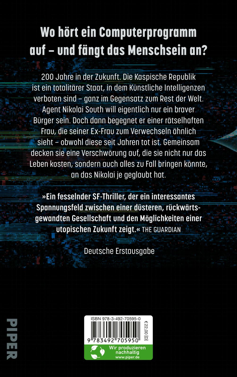 200 Jahre in der Zukunft. Androiden leben als gewöhnliche Bürger unter den Menschen, außer in der isolierten Diktatur der Kaspischen Republik: Hier hat man jegliche künstliche Intelligenz verboten. Als Lily Xirau, die Witwe des ermordeten politischen Propagandisten Paulo Xirau, ins Land kommt, um seine Überreste zu identifizieren, bekommt Agent Nikolai South den Auftrag, sie zu eskortieren. Doch Lily sieht Souths verstorbener Ehefrau zum Verwechseln ähnlich, und wie sich herausstellt, war der Ermordete selbst eine KI. South ahnt schnell, das irgendetwas hier ganz und gar nicht stimmt ...