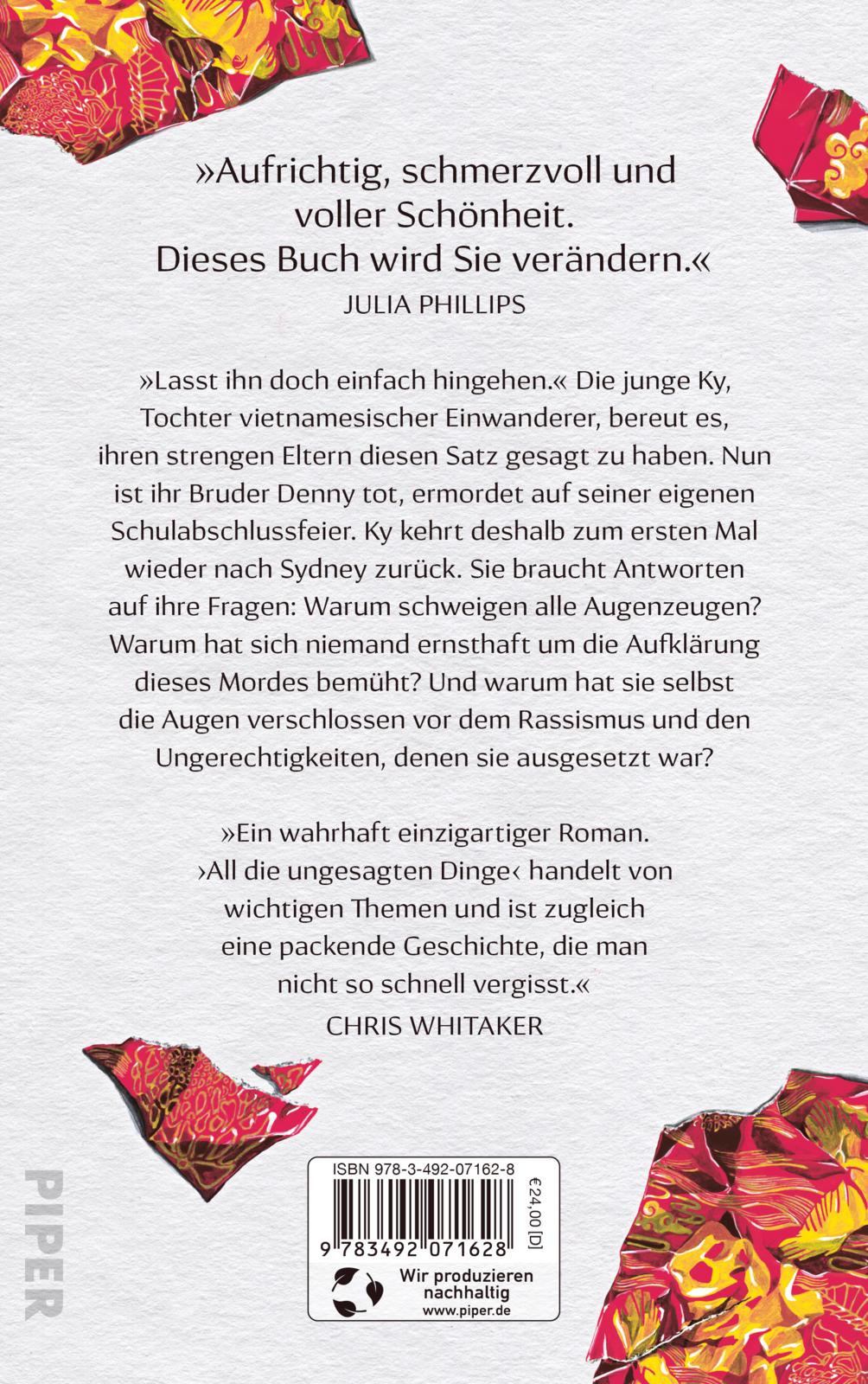 Und nach Jahren kehrt Ky nach Cabramatta zurück, einem Einwanderervorort von Sydney, wo ihre Eltern noch immer leben. Mit ihnen will sie trauern, aber sie möchte auch Antworten auf ihre Fragen: Warum schweigen alle Augenzeugen? Warum hat sich nie jemand ernsthaft um die Aufklärung dieser Tat bemüht? Und warum hat sie selbst die Augen verschlossen vor dem Rassismus und den Ungerechtigkeiten, denen sie ausgesetzt war?