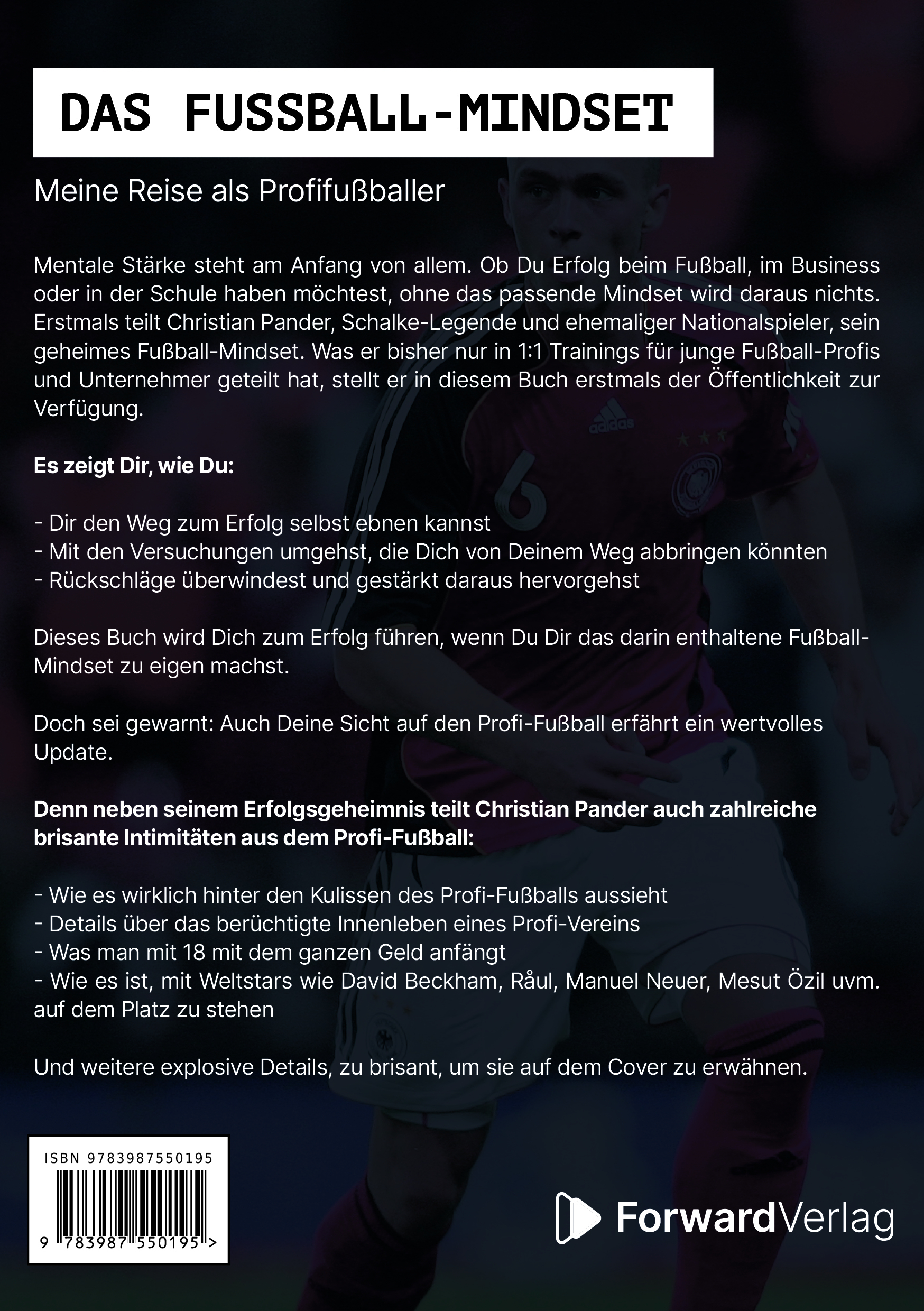 Mentale Stärke steht am Anfang von allem. Ob Du Erfolg beim Fußball, im Business oder in der Schule haben möchtest, ohne das passende Mindset wird daraus nichts. Erstmals teilt Christian Pander, Schalke-Legende und ehemaliger deutscher Nationalspieler, sein geheimes Fußball-Mindset in aller Öffentlichkeit. Was er bisher nur in exklusiven 1:1 Trainings für junge Fußball-Profis und erfolgreiche Unternehmer geteilt hat, stellt er in diesem Buch erstmals der breiten Öffentlichkeit zur Verfügung.