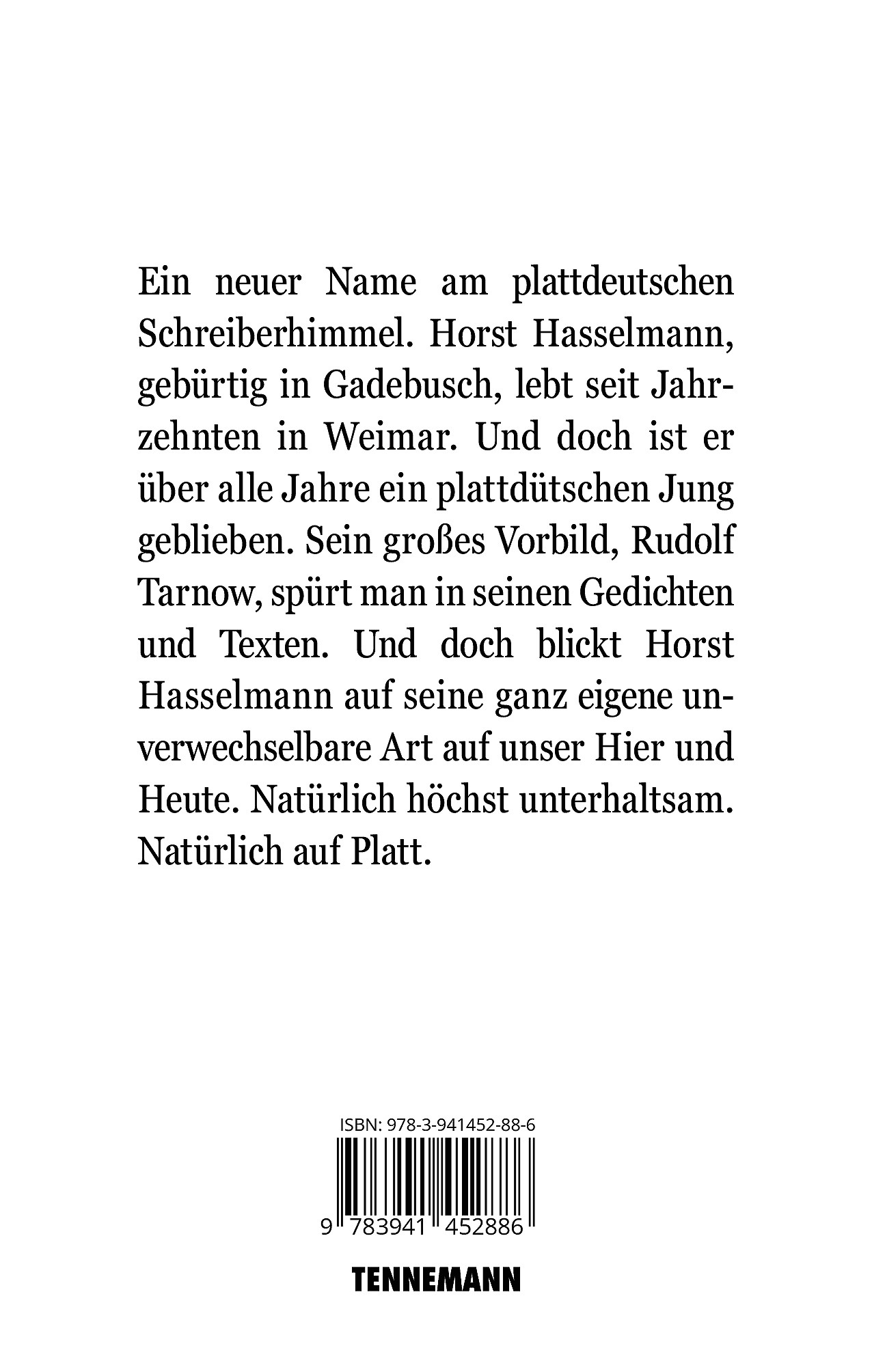 | Schlagworte | de ümfallen schauh • horst hasselmann • Läuschen • Niederdeutsch • niederdeutsche Sprache • niederdeutsch humor • niederdeutsch literatur • Plattdeutsch • Plattdeutsche Literatur • Plattdeutscher Humor • Plattdeutsche Sprache • Riemels • Rudolf Tarnow • tennemann • tennemann plattdeutsch • tennemann verlag |