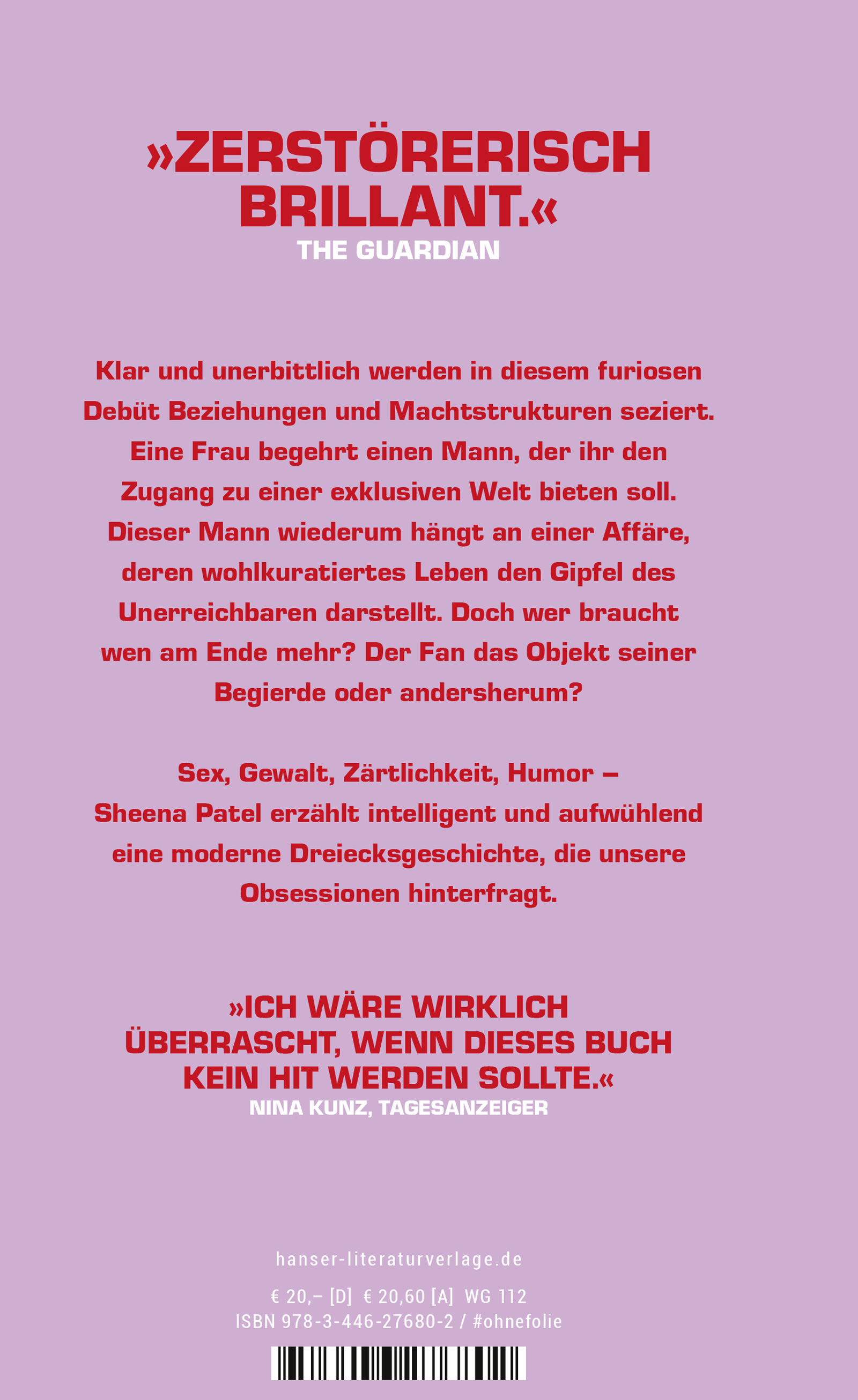 Sex, Gewalt, Zärtlichkeit, Humor - in ihrem furiosen Debüt seziert Sheena Patel klug und aufwühlend Beziehungen und Machtstrukturen. Ein atemloser Text, der direkt in die Magengrube fährt und unsere Obsessionen hinterfragt.