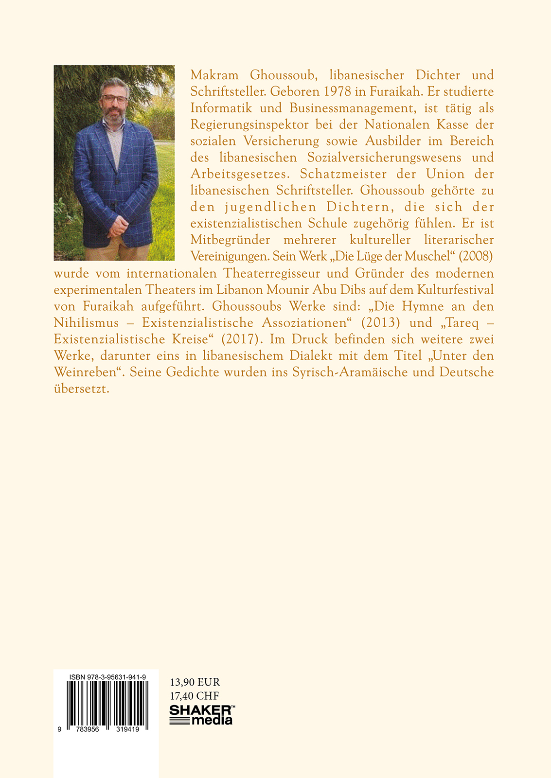 Makram Ghoussoub, libanesischer Dichter und Schriftsteller. Geboren 1978 in Furaikah. Er studierte Informatik und Businessmanagement, ist tätig als Regierungsinspektor bei der Nationalen Kasse der sozialen Versicherung sowie Ausbilder im Bereich des libanesischen Sozialversicherungswesens und Arbeitsgesetzes. Schatzmeister der Union der libanesischen Schriftsteller. Ghoussoub gehörte zu den jugendlichen Dichtern, die sich der existenzialistischen Schule zugehörig fühlen. Er ist Mitbegründer mehrerer kultureller literarischer Vereinigungen. Sein Werk "Die Lüge der Muschel" (2008) wurde vom internationalen Theaterregisseur und Gründer des modernen experimentalen Theaters im Libanon Mounir Abu Dibs auf dem Kulturfestival von Furaikah aufgeführt. Ghoussoubs Werke sind: "Die Hymne an den Nihilismus - Existenzialistische Assoziationen" (2013) und "Tareq - Existenzialistische Kreise" (2017). Im Druck befinden sich weitere zwei Werke, darunter eins in libanesischem Dialekt mit dem Titel "Unter den Weinreben". Seine Gedichte wurden ins Syrisch~Aramäische und Deutsche übersetzt.