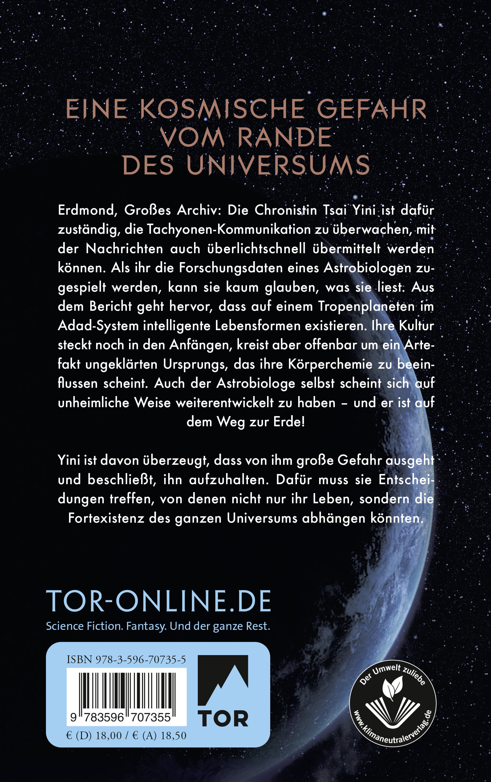 Erdmond, Großes Archiv: Die Chronistin Tsai Yini ist dafür zuständig, die Tachyonen-Kommunikation zu überwachen, die in Überlichtgeschwindigkeit möglich ist. Als ihr die Forschungsdaten eines Astrobiologen zugespielt werden, kann sie kaum glauben, was sie liest. Aus dem Bericht geht hervor, dass auf einem Tropenplaneten im Gliese-System intelligente Lebensformen existieren. Ihre Kultur steckt noch in den Anfängen, kreist aber offenbar um ein Artefakt ungeklärten Ursprungs, das ihre Körperchemie zu beeinflussen scheint. Auch der Astrobiologe selbst scheint sich auf unheimliche Weise weiterentwickelt zu haben - und er ist auf dem Weg zur Erde! Yini ist davon überzeugt, das von ihm große Gefahr ausgeht und beschließt, ihn aufzuhalten. Dafür muss sie Entscheidungen treffen, von denen nicht nur ihr Leben, sondern die Fortexistenz des ganzen Universums abhängen könnte.