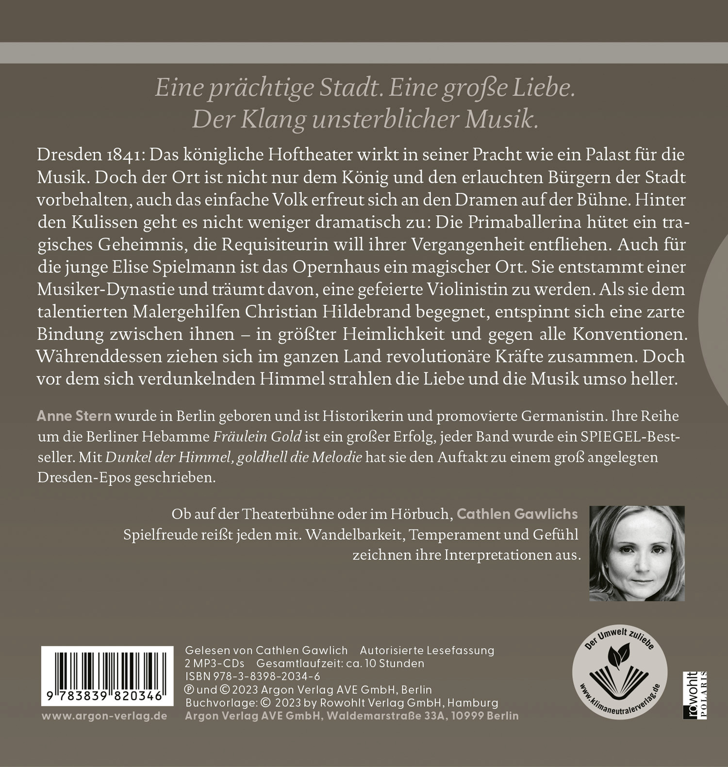 | Schlagworte | Adel • Ballett • Bestseller • Bühne • carolabrücke dresden • Drama • Dunkel der Himmel, goldhell die Melodie • Elbe • Elbflorenz • Familie • Frau • Frauenschicksal • Fräulein Gold • Geschichte • Gottfried Semper • Karlsplatzreihe • König • Kunsthandwerk • Liebe • Liebesroman • Maler • Malerei • Märzrevolution • Meißen • Musik • Napoleon • Oper • Opernhaus • Preußen • Reichsgründung • Revolution • Richard Wagner • Romane Neuerscheinungen 2023 • Sachsen • Saga • Schauspiel • Schicksal • Semperoper • Starke Frau • Theater • Violinistin |