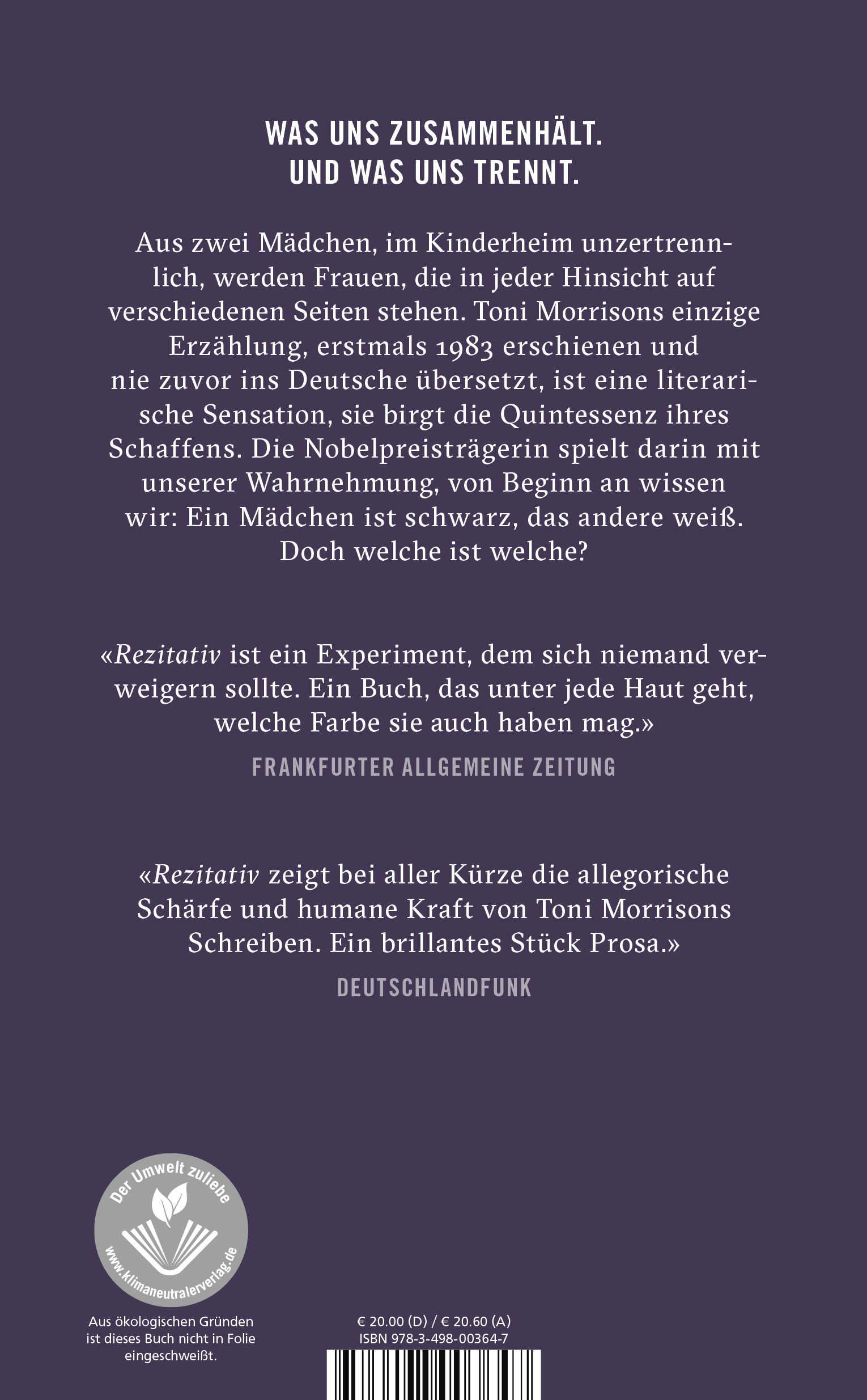 Die Wiederentdeckung von Toni Morrisons einziger Erzählung ist eine literarische Sensation und enthält die Quintessenz ihres Schaffens. Die Nobelpreisträgerin spielt darin mit unserer Wahrnehmung: Von Beginn an wissen wir, dass eine der beiden Hauptfiguren schwarz ist und die andere weiß - doch welche ist welche?