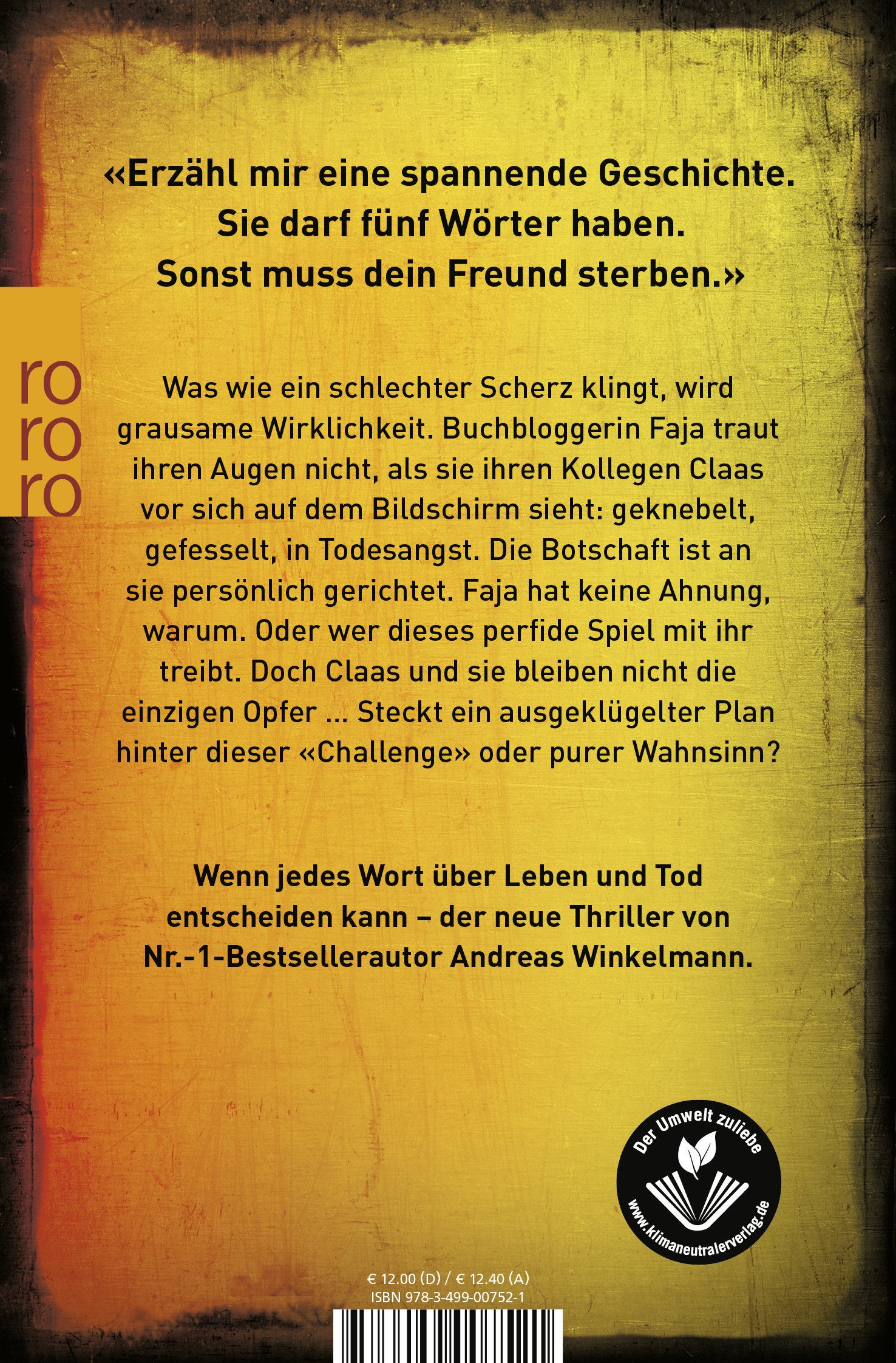 «Erzähl mir eine spannende Geschichte. Sie darf fünf Wörter haben. Sonst muss dein Freund sterben.» Was wie ein schlechter Scherz klingt, wird grausame Wirklichkeit. Buchbloggerin Faja traut ihren Augen nicht, als sie ihren Kollegen Claas vor sich auf dem Bildschirm sieht: geknebelt, gefesselt, in Todesangst. Die Botschaft ist an sie persönlich gerichtet. Faja hat keine Ahnung, warum. Oder wer dieses perfide Spiel mit ihr treibt. Doch Claas und sie bleiben nicht die einzigen Opfer ...