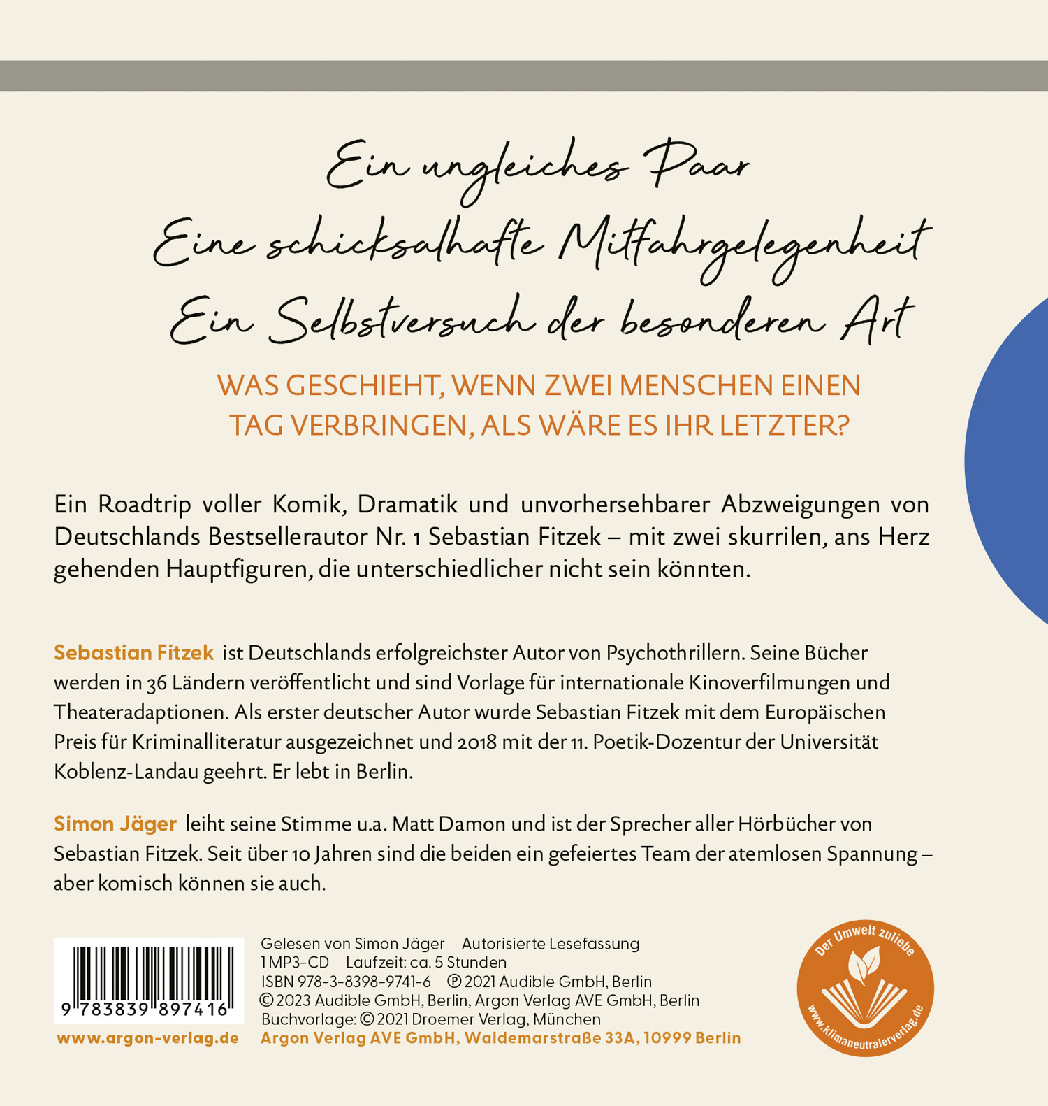 | Schlagworte | Aufbruch • Berlin • Bestsellerautor • Comedy • ein etwas anderer Fitzek • Fahrgemeinschaft • Fitzek Humor • Fitzek kein Thriller • Fitzek Moderator • Freundschaft • Gedankenexperiment • Hamburg • Humor • humorvolles Hörbuch • Lea von Armin • Lebenskunst • Lebensphilosophie • letzter Tag des Lebens • Mietwagen • Mut • neuer Fitzek • Reise • Road Novel • Roadtrip • Romane Neuerscheinungen 2023 • Selbstexperiment • Selbstfindung • Simon Jäger • Spiegel Bestseller 2024 • spiegel bestsellerliste • Starke Frau • Tragikkomödie • Ungewöhnliche Freundschaft |
