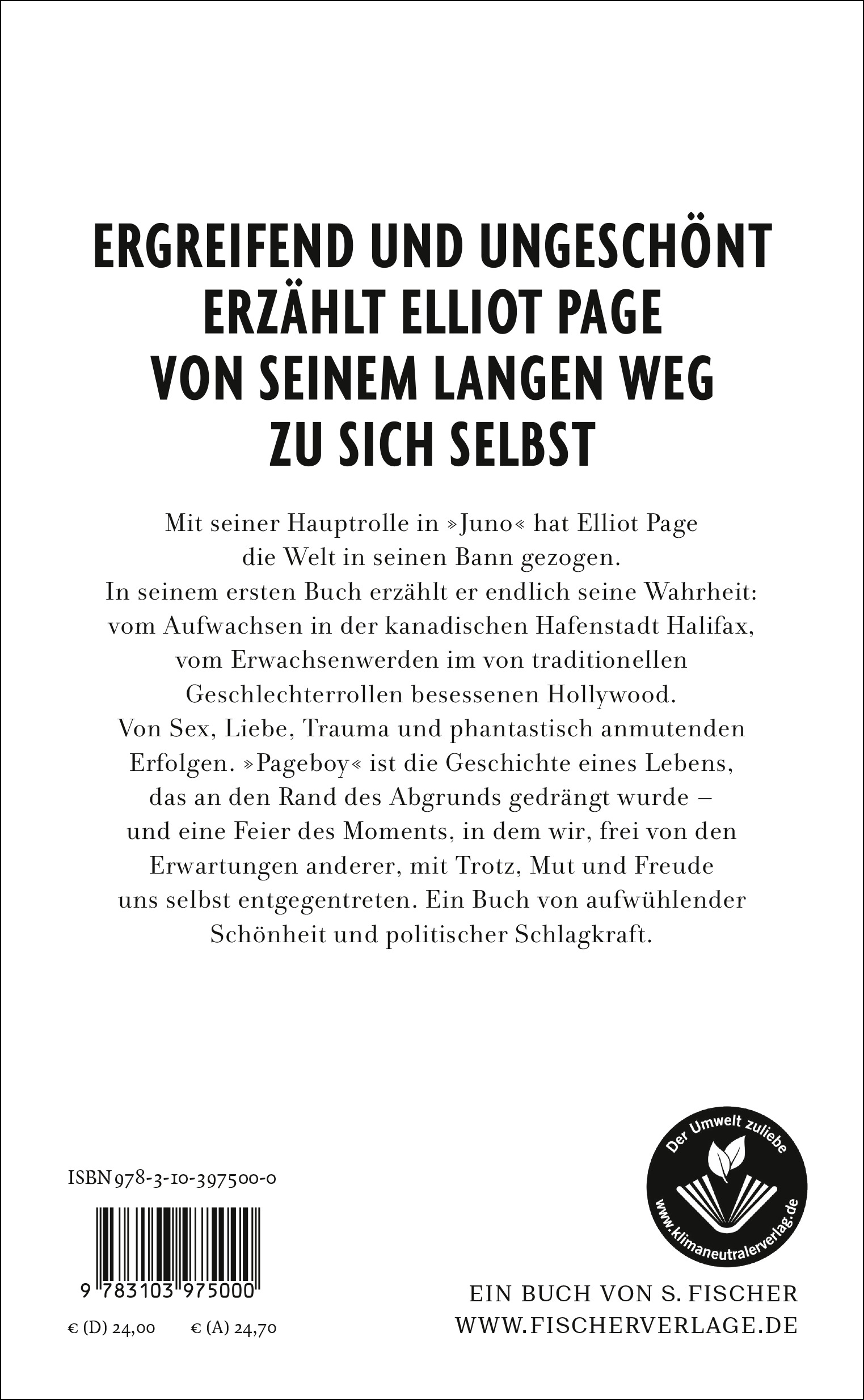 Mit seiner Hauptrolle in »Juno« hat Elliot Page die Welt in seinen Bann gezogen. In seinem ersten Buch erzählt er endlich seine Wahrheit: vom Aufwachsen in der kanadischen Hafenstadt Halifax, vom Erwachsenwerden im von traditionellen Geschlechterrollen besessenen Hollywood. Von Sex, Liebe, Trauma und phantastisch anmutenden Erfolgen. »Pageboy« ist die Geschichte eines Lebens, das an den Rand des Abgrunds gedrängt wurde - und eine Feier des Moments, in dem wir, frei von den Erwartungen anderer, mit Trotz, Mut und Freude uns selbst entgegentreten. Ein Buch von aufwühlender Schönheit und politischer Schlagkraft.