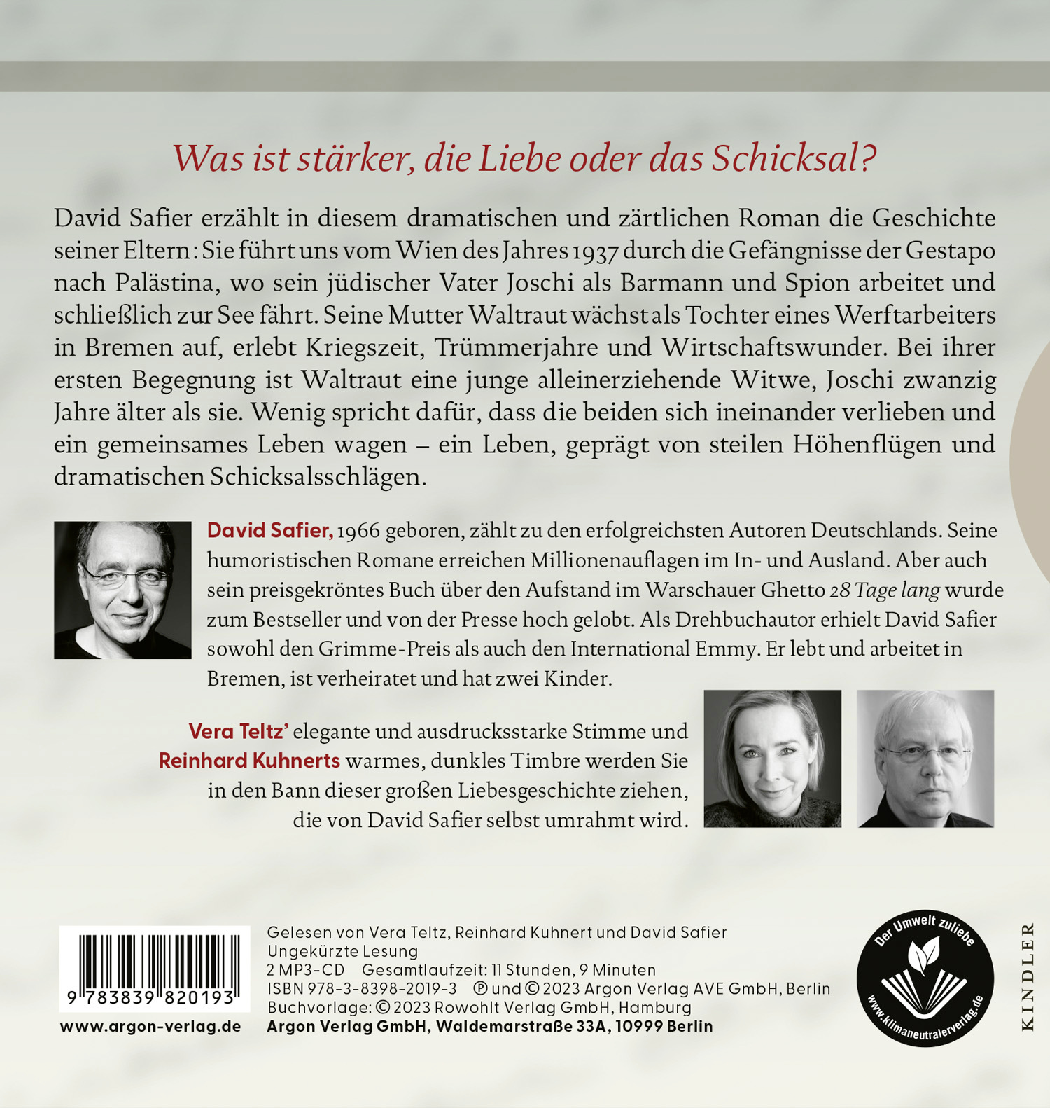 Bestsellerautor David Safier erzählt die Geschichte seiner Eltern: Sie führt uns vom Wien des Jahres 1938, als sein Vater Joschi dort studierte, über die Gefängnisse der Gestapo bis nach Palästina, wo er als Barmann und Spion arbeitete und schließlich zur See fuhr.