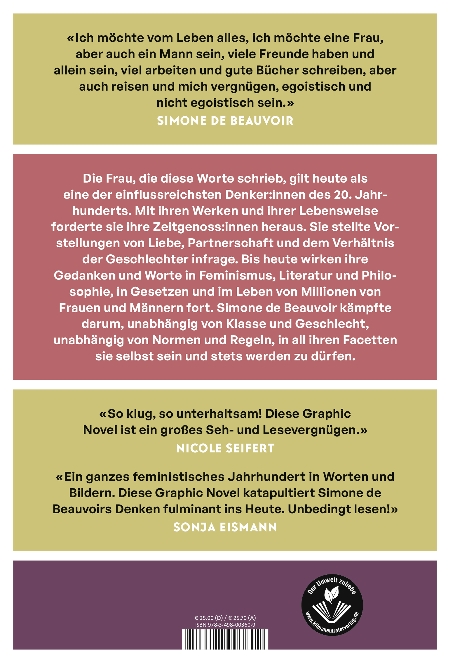 Die junge Frau, die diese Worte schrieb, gilt heute als eine der einflussreichsten Denker:innen des 20. Jahrhunderts. Mit ihren Werken, ihrer Philosophie und Lebensweise forderte sie ihre Zeitgenoss:innen heraus und veränderte unsere Vorstellung von Liebe, Partnerschaft und dem Verhältnis der Geschlechter. Wer die Graphic Novel von Julia Bernhard und Julia Korbik aufschlägt, der entdeckt darin ein volles Leben: reich an Erkenntnis, an Schmerz und Freude, das Leben einer Frau, die in all ihren Lebensaltern von der Neugierde auf sich und die Menschen getrieben war und die darum kämpfte, unabhängig von Klasse und Geschlecht, unabhängig von Normen und Regeln, in all ihren Facetten sie selbst sein und stets werden zu dürfen.