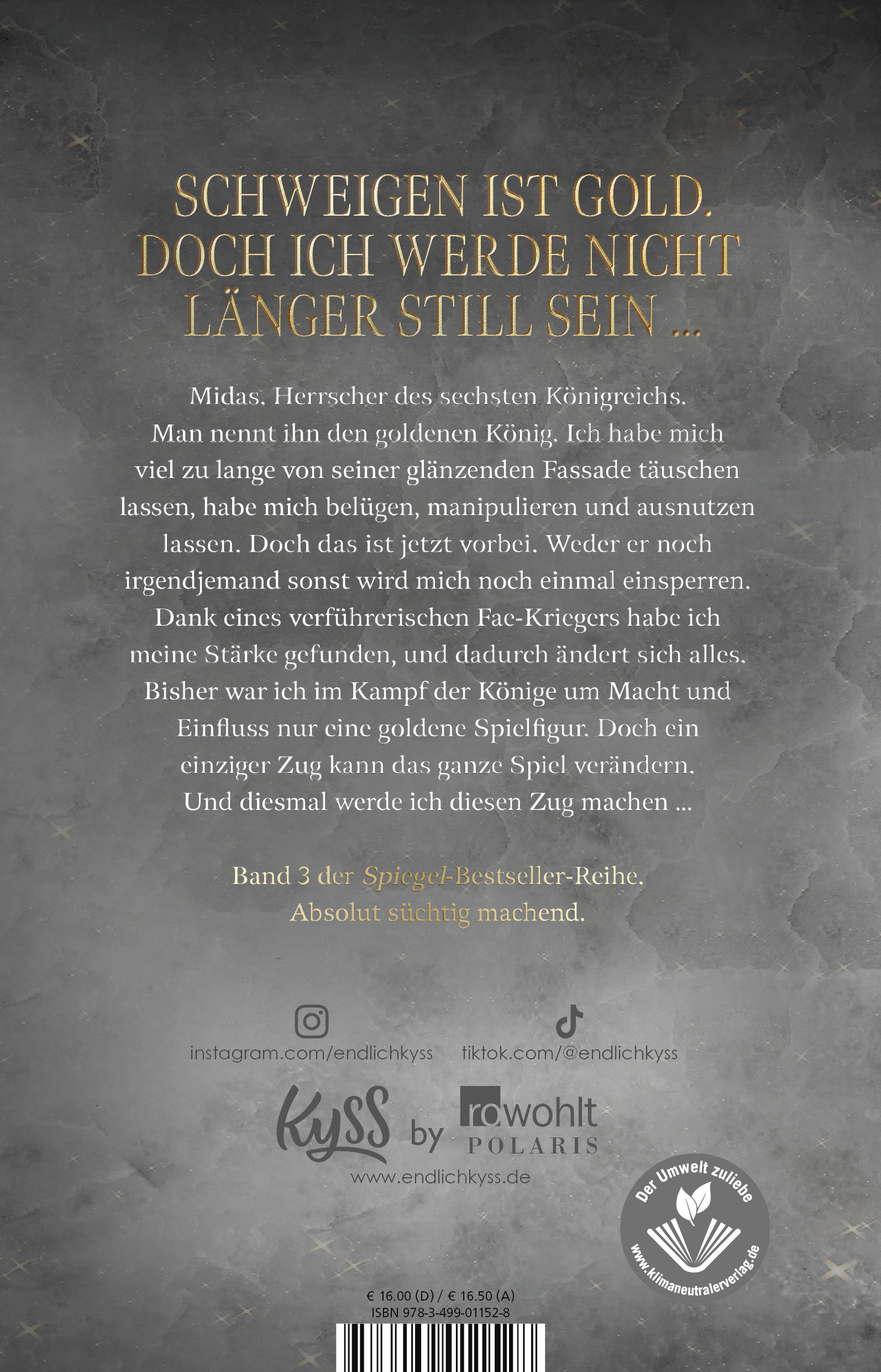 Midas. Herrscher des sechsten Königreichs. Man nennt ihn den goldenen König. Ich habe mich viel zu lange von seiner glänzenden Fassade täuschen lassen, habe mich belügen, manipulieren und ausnutzen lassen. Doch das ist jetzt vorbei. Weder er noch irgendjemand sonst wird mich noch einmal einsperren. Dank eines verführerischen Fae-Kriegers habe ich meine Stärke gefunden, und dadurch ändert sich alles. Bisher war ich im Kampf der Könige um Macht und Einfluss nur eine goldene Spielfigur. Doch ein einziger Zug kann das ganze Spiel verändern. Und diesmal werde ich diesen Zug machen ...