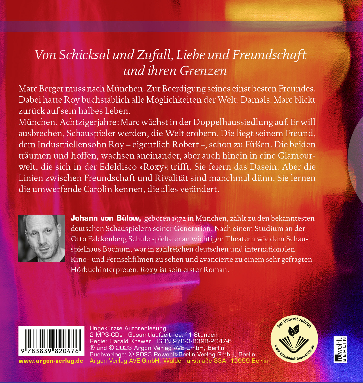Johann von Bülow beeindruckt als charismatischer Schauspieler in Filmen wie Frantz von François Ozon und Elser von Oliver Hirschbiegel oder auch in TV-Serien wie Mord mit Aussicht und Das Boot. Als Hörbuchsprecher versteht er es, Geschichten so mitreißend wie klug und feinfühlig zu interpretieren. Mit Roxy veröffentlicht er 2023 seinen ersten Roman.