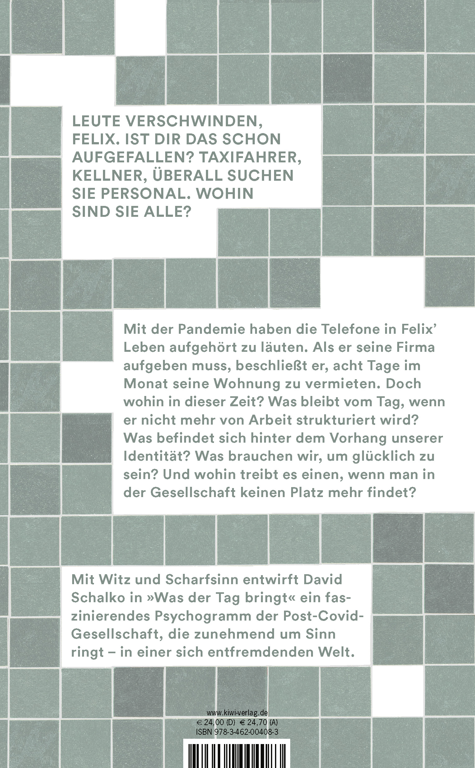 Mit unnachahmlichem Witz und Scharfsinn erzählt David Schalko von einem, dem das Leben entgleist und die Gesellschaft abhandenkommt, der um Existenz und Sinn ringt in einer ihm immer fremder werdenden Welt. »Was der Tag bringt« ist ein faszinierendes Psychogramm der Post-Covid-Gesellschaft und ein Text, der die großen Fragen der Zeit mit erzählerischer Leichtigkeit verhandelt.