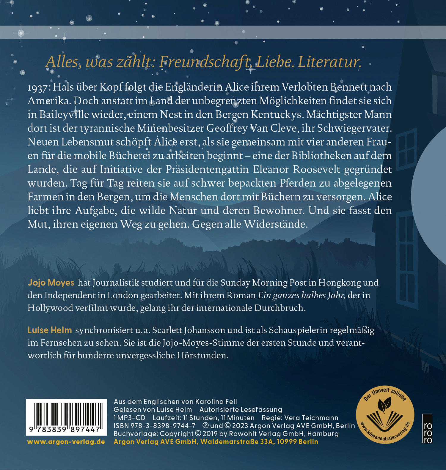 Neuen Lebensmut schöpft Alice erst, als sie sich den Frauen der Packhorse Library anschließt, einer der Bibliotheken auf dem Lande, die auf Initiative von Eleanor Roosevelt gegründet wurden. Wer zu krank oder zu alt ist, dem bringen die Frauen die Bücher nach Hause. Tag für Tag reiten sie auf schwer bepackten Pferden in die Berge.