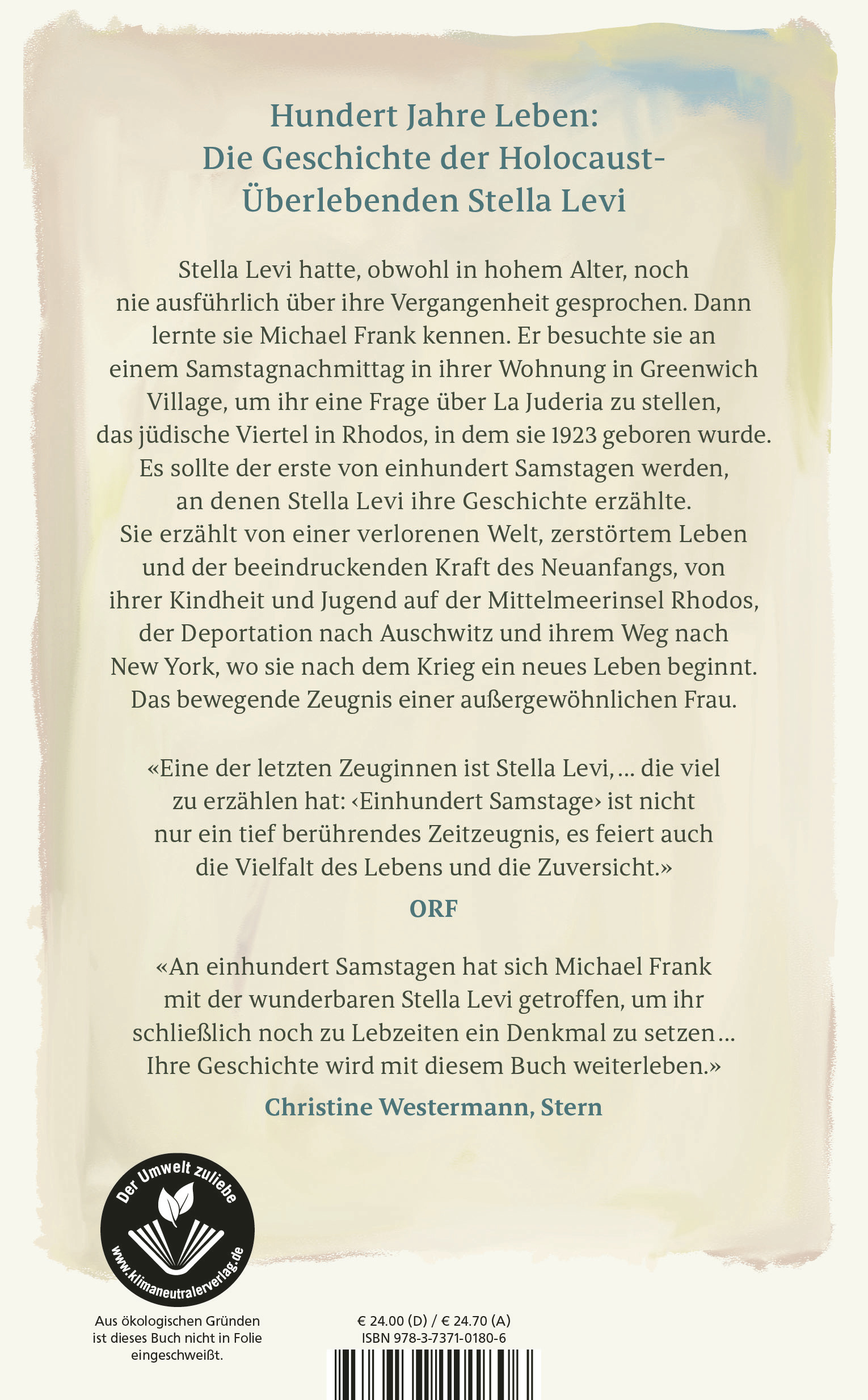 Als Michael Frank die heute hundertjährige Stella Levi zufällig kennenlernt, nimmt eine große Geschichte ihren Anfang. Sie lädt ihn in ihr New Yorker Apartment ein, und bald wird aus den Besuchen ein Ritual: An hundert Samstagen erzählt Levi dem Schriftsteller ihr Leben. Gemeinsam suchen und erkunden die beiden eine fast märchenhafte, verlorene Welt. Levi, geboren 1923, wuchs auf im jüdischen Viertel La Juderia auf der Mittelmeerinsel Rhodos - eine Kindheit und Jugend zwischen sephardischer Tradition und Moderne, inmitten einer Vielfalt von Kulturen und Sprachen zwischen Orient und Okzident. Stella eifert der Schwester Felicie nach, die Freud und Henri Bergson liest; sie selbst träumt vom Studium in Italien. Schließlich aber werden diese Welt und die Familie grausam zerrissen, und Stella Levi erzählt auch davon: Im Herbst 1943 besetzen die Deutschen die Insel, für Levi der Anfang eines Leidenswegs, der sie bis nach Auschwitz führt. Sie überlebt - und beginnt ein ganz neues Leben in den USA.