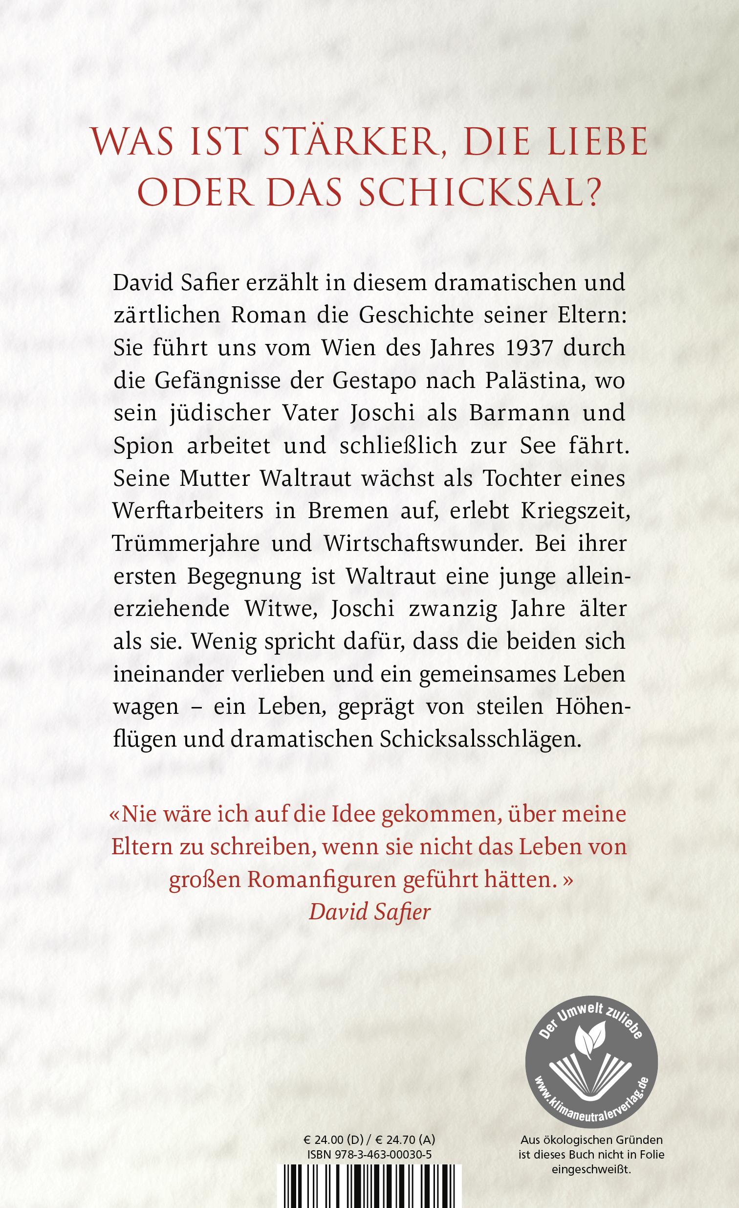 David Safier erzählt in diesem dramatischen und zärtlichen Roman die Geschichte seiner Eltern: Sie führt uns vom Wien des Jahres 1937, durch die Gefängnisse der Gestapo, nach Palästina, wo sein Vater Joschi als Barmann und Spion arbeitet und schließlich zur See fährt. Seine Mutter Waltraut wächst als Tochter eines Werftarbeiters in Bremen auf, erlebt Kriegszeit, Trümmerjahre und Wirtschaftswunder. Bei ihrer ersten Begegnung ist Waltraut eine junge alleinerziehende Witwe, Joschi zwanzig Jahre älter als sie. Wenig spricht dafür, dass die beiden sich ineinander verlieben und ein gemeinsames Leben wagen - ein Leben geprägt von steilen Höhenflügen und dramatischen Schicksalsschlägen.