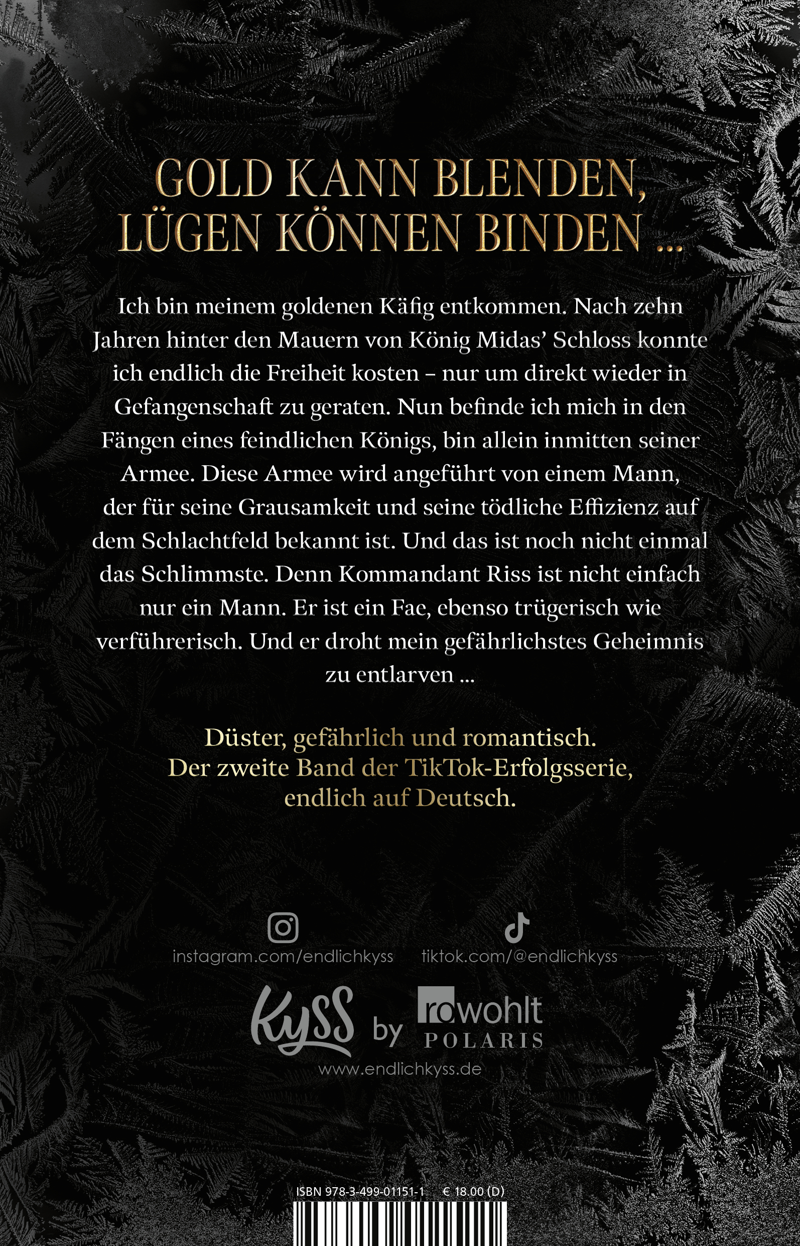 Ich bin meinem goldenen Käfig entkommen. Nach zehn Jahren hinter den Mauern von König Midas' Schloss konnte ich endlich die Freiheit kosten - nur um direkt wieder in Gefangenschaft zu geraten. Nun befinde ich mich in den Fängen eines feindlichen Königs, bin allein inmitten seiner Armee. Diese Armee wird angeführt von einem Mann, der für seine Grausamkeit und seine tödliche Effizienz auf dem Schlachtfeld bekannt ist. Und das ist noch nicht einmal das Schlimmste. Denn Kommandant Riss ist nicht einfach nur ein Mann. Er ist ein Fae, ebenso trügerisch wie verführerisch. Und er droht mein gefährlichstes Geheimnis zu entlarven ...