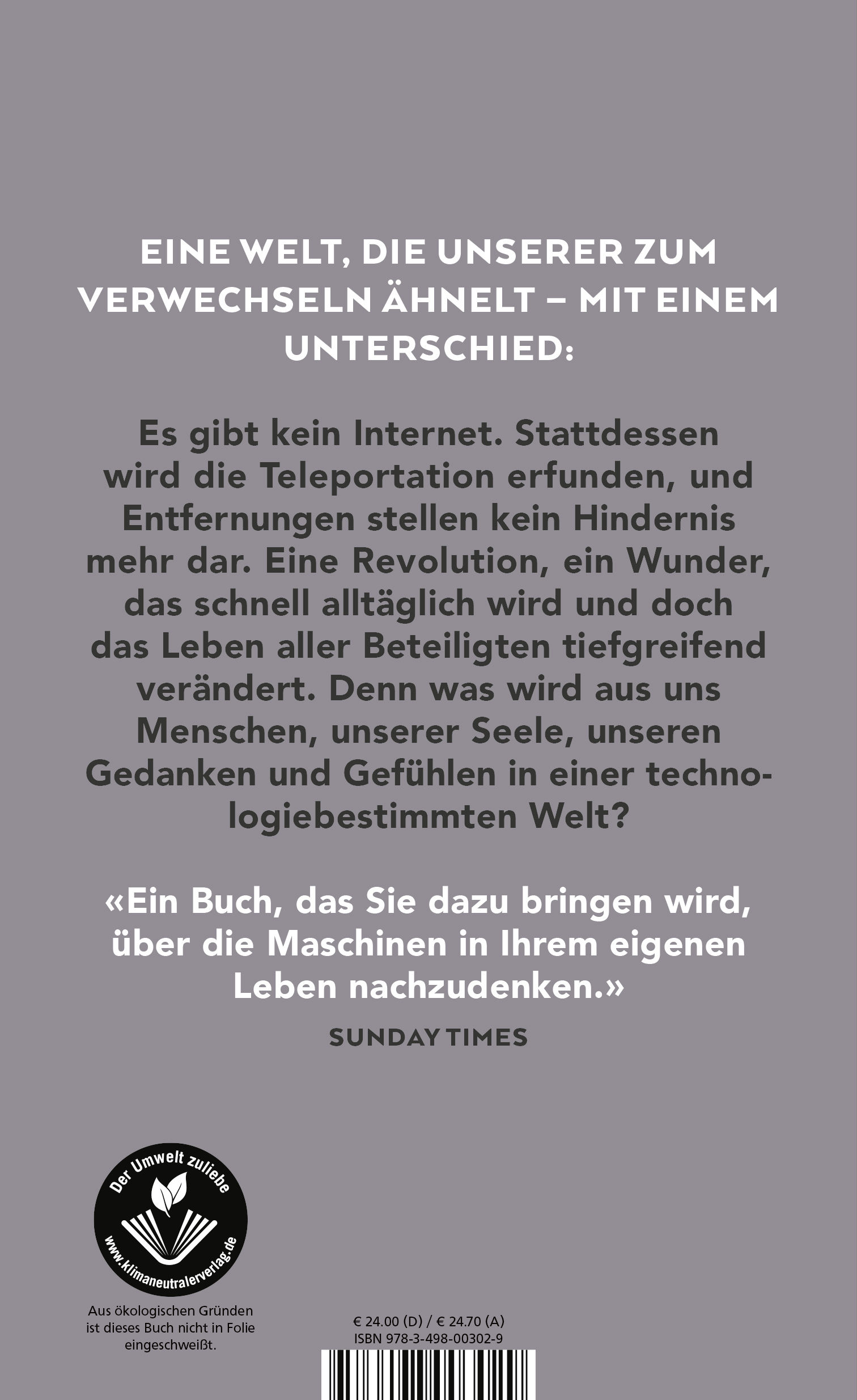 Eine Welt, die unserer zum Verwechseln ähnelt - mit einem Unterschied: Es gibt kein Internet. Stattdessen wird die Teleportation erfunden, und Entfernungen stellen kein Hindernis mehr dar. Eine Revolution, ein Wunder, das schnell alltäglich wird und doch das Leben aller Beteiligten tiefgreifend verändert: von den ersten Versuchen, einem teleportierten Eierlöffel, bis zur selbstverständlichen, unmittelbaren Bewegung von Menschen.