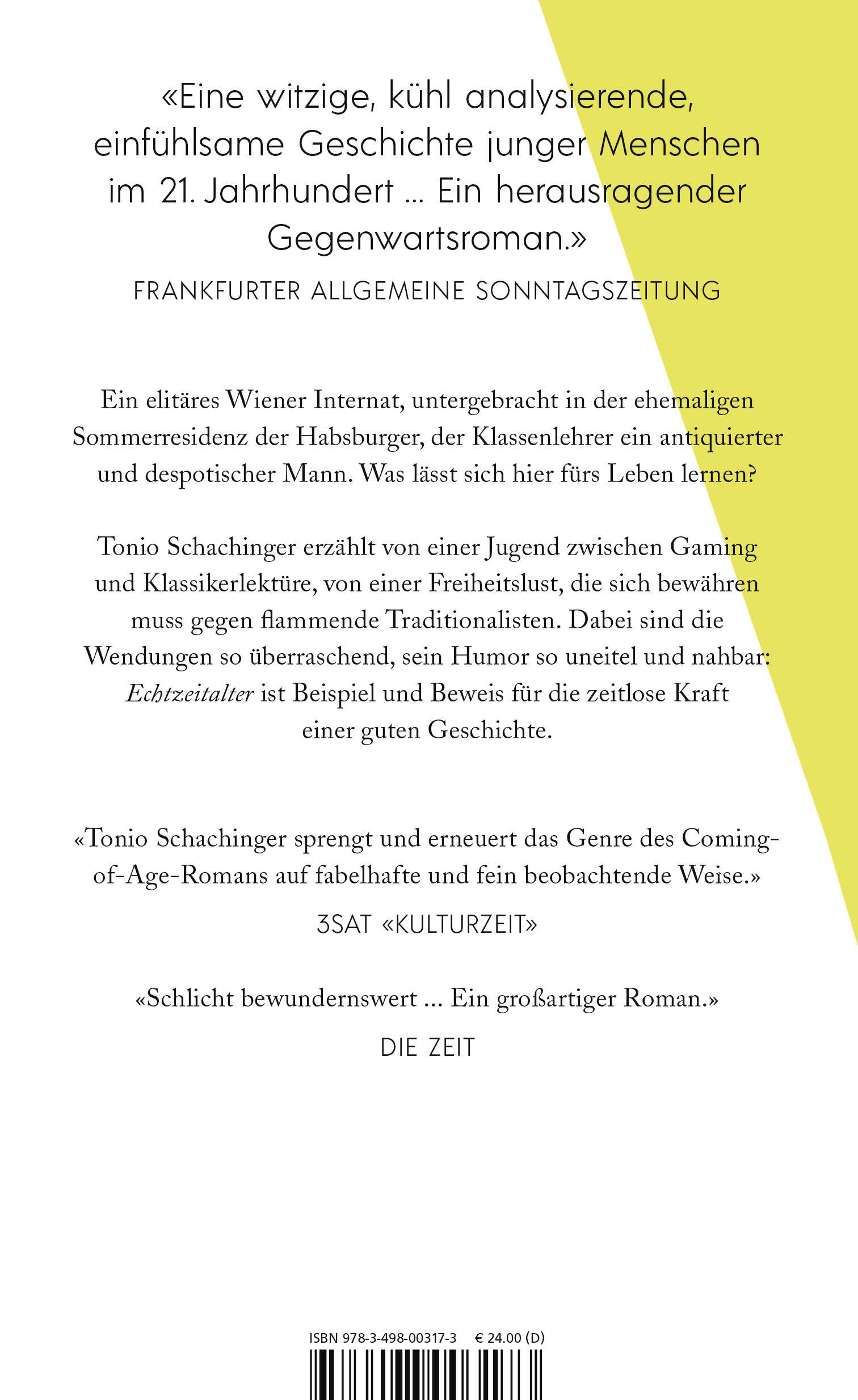 Tonio Schachinger erzählt von einer Jugend zwischen Gaming und Klassikerlektüre, von Freiheitslust, die sich bewähren muss gegen flammende Traditionalisten - und von dem unkalkulierbaren Rest, der nicht nur die Abschlussklasse 2020 vor ungesehene Herausforderungen stellt. Dabei sind die Wendungen so überraschend, sein Humor so uneitel und nahbar: Echtzeitalter ist Beispiel und Beweis für die zeitlose Kraft einer guten Geschichte. Und ein großer Gesellschaftsroman.