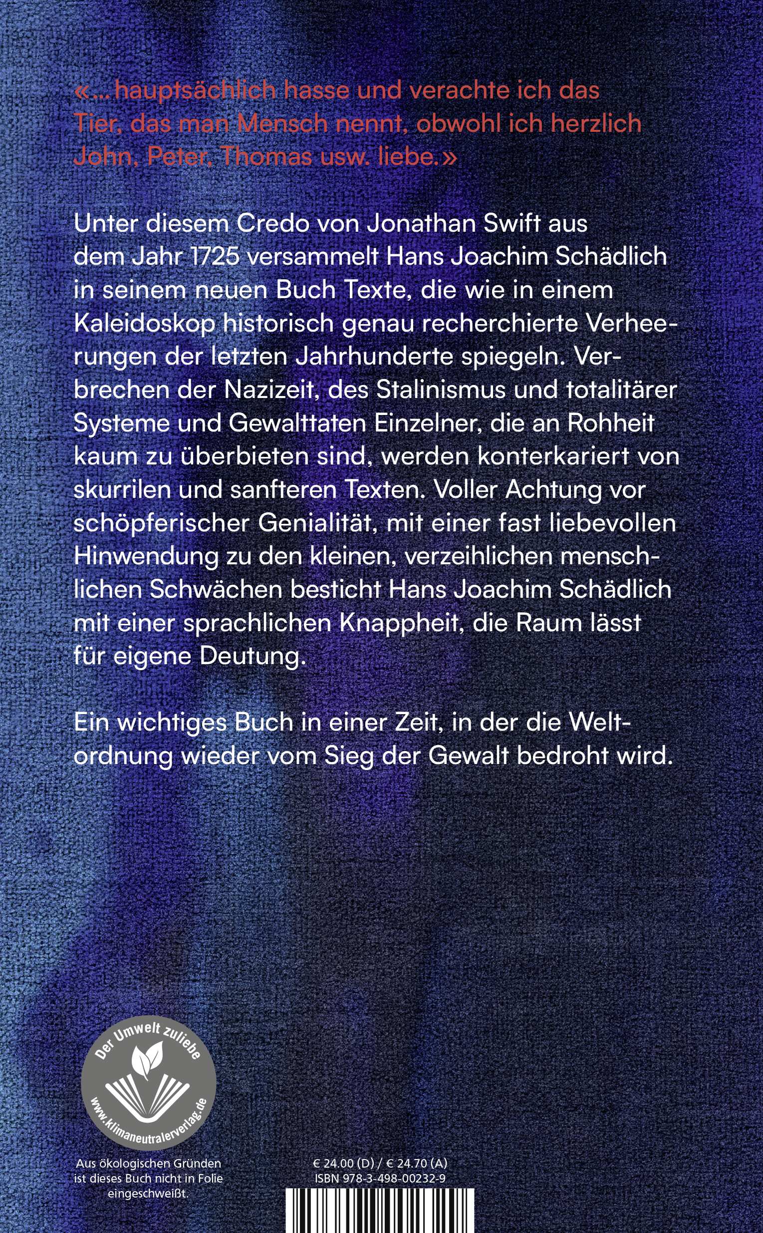 «... hauptsächlich hasse und verachte ich das Tier, das man Mensch nennt, obwohl ich herzlich John, Peter, Thomas usw. liebe.» Unter diesem Credo von Jonathan Swift aus dem Jahr 1725 versammelt Hans Joachim Schädlich in seinem neuen Buch Texte, die wie in einem Kaleidoskop historisch genau recherchierte Verheerungen der letzten Jahrhunderte spiegeln.