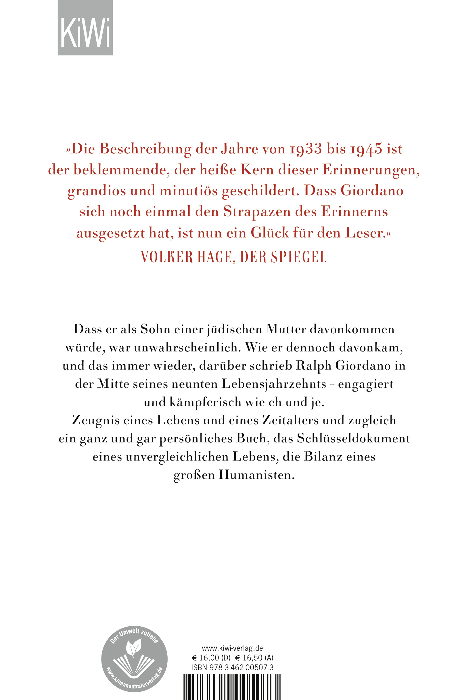 Dass er als Sohn einer jüdischen Mutter davonkommen würde, war unwahrscheinlich. Wie er dennoch davonkam, und das immer wieder, davon schreibt Ralph Giordano so engagiert wie klarsichtig. Eigenschaften, die ihn zu einem der prägenden Publizisten der Bundesrepublik machen würden.