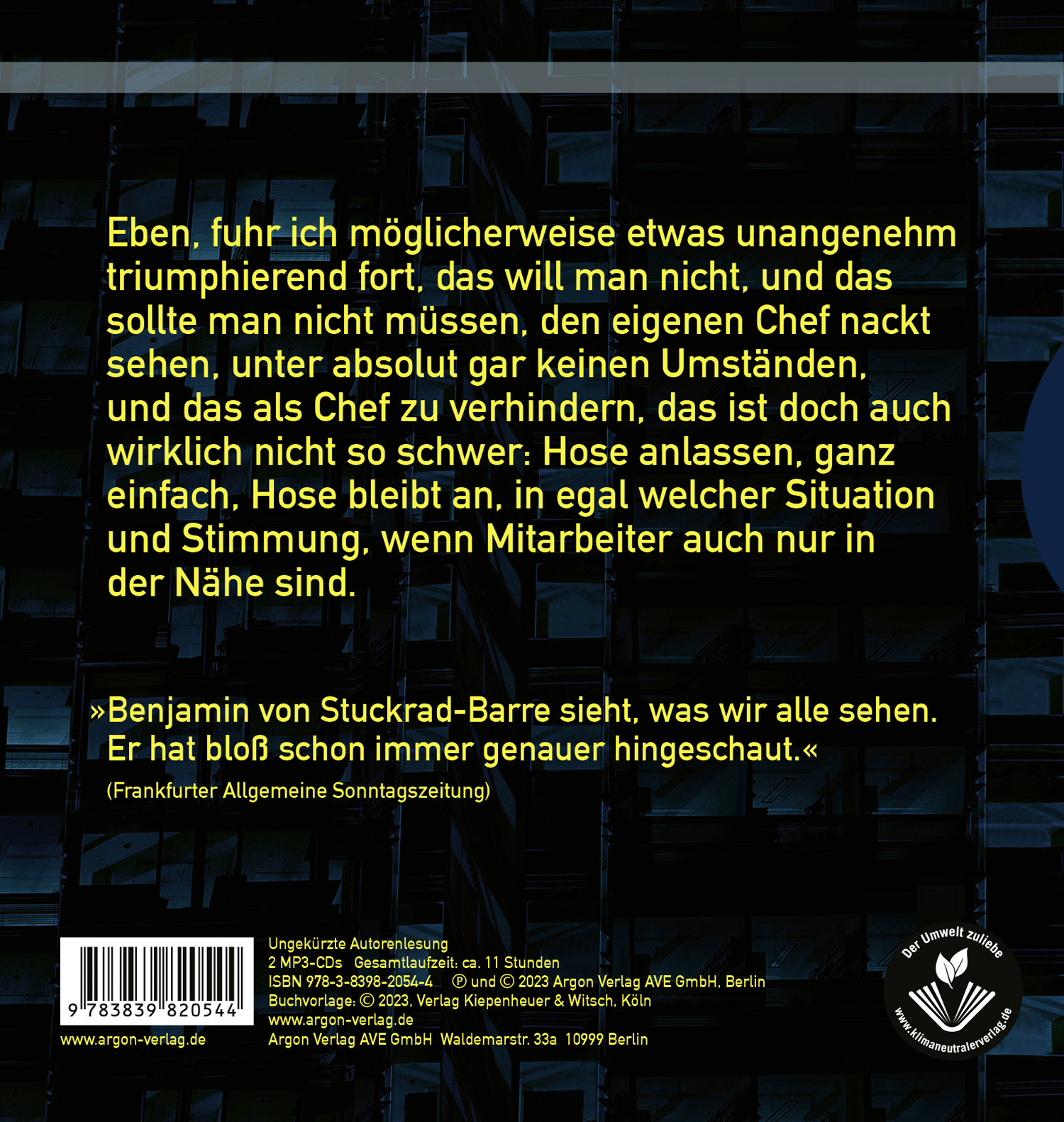 Benjamin von Stuckrad-Barre, 1975 in Bremen geboren, ist Autor von Soloalbum, 1998, Livealbum, 1999, Remix, 1999, Blackbox, 2000, Transkript, 2001, Deutsches Theater, 2001, Festwertspeicher der Kontrollgesellschaft – Remix 2, 2004, Was.Wir.Wissen, 2005, Auch Deutsche unter den Opfern, 2010, Panikherz, 2016, Nüchtern am Weltnichtrauchertag, 2016, Udo Fröhliche, 2016, Ich glaub, mir geht’s nicht so gut, ich muss mich mal hinlegen – Remix 3, 2018 und Alle sind so ernst geworden (mit Martin Suter), 2020.