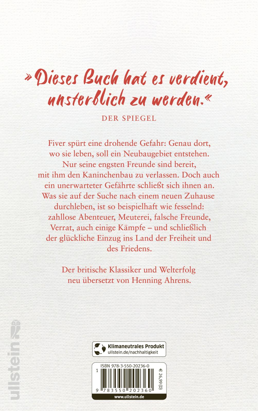 Die weltbekannte Saga vom Exodus der Kaninchen. Das Thema könnte nicht zeitgemäßer sein, denn genau dort, wo sie leben, entsteht ein Neubaugebiet: Der junge Fiver spürt, dass seinem Volk das Verderben droht. Nur seine engsten Freunde kann er überreden, mit ihm den Kaninchenbau zu verlassen und sich auf die Suche nach einer neuen Heimat zu machen. Doch auch ein unerwarteter Gefährte schließt sich ihnen an. Was sie unterwegs durchleben, ist so beispielhaft wie fesselnd: zahllose Abenteuer, falsche Freunde, Meuterei, Verrat und Heldentum, Schlachten mit hohem Blutzoll - und schließlich der glückliche Einzug ins Land der Freiheit und des Friedens.