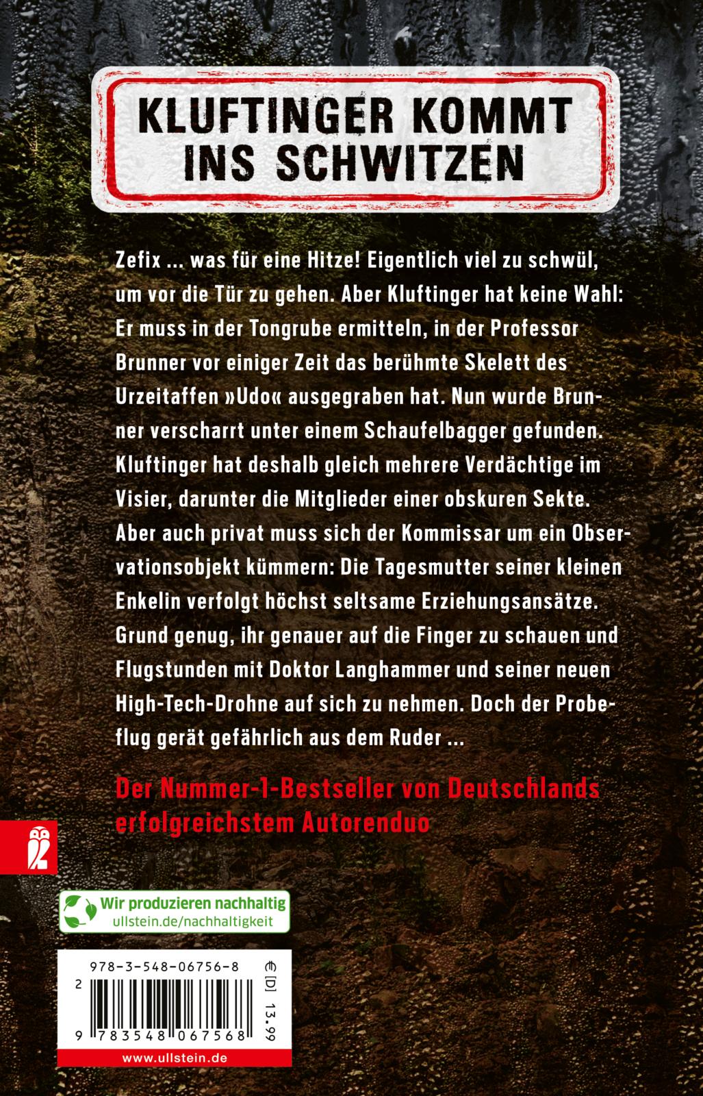 Zefix ... was für eine Hitze! Eigentlich viel zu schwül, um vor die Tür zu gehen. Aber Kluftinger hat keine Wahl: Er muss in der Tongrube ermitteln, in der Professor Brunner vor einiger Zeit das berühmte Skelett des Urzeitaffen "Udo" ausgegraben hat. Nun wurde Brunner verscharrt unter einem Schaufelbagger gefunden. Der Wissenschaftler, der mit seinem Fund beweisen wollte, dass die Wiege der Menschheit im Allgäu liegt, hatte viele Feinde. Kluftinger hat deshalb gleich mehrere Verdächtige im Visier, darunter die Mitglieder einer obskuren Sekte. Aber auch privat muss sich der Kommissar um ein Observationsobjekt kümmern: Die Tagesmutter seiner kleinen Enkelin verfolgt höchst seltsame Erziehungsansätze. Grund genug, ihr genauer auf die Finger zu schauen und Flugstunden mit Doktor Langhammer und seiner neuen High-Tech-Drohne auf sich zu nehmen. Doch der Probeflug gerät gefährlich aus dem Ruder ...