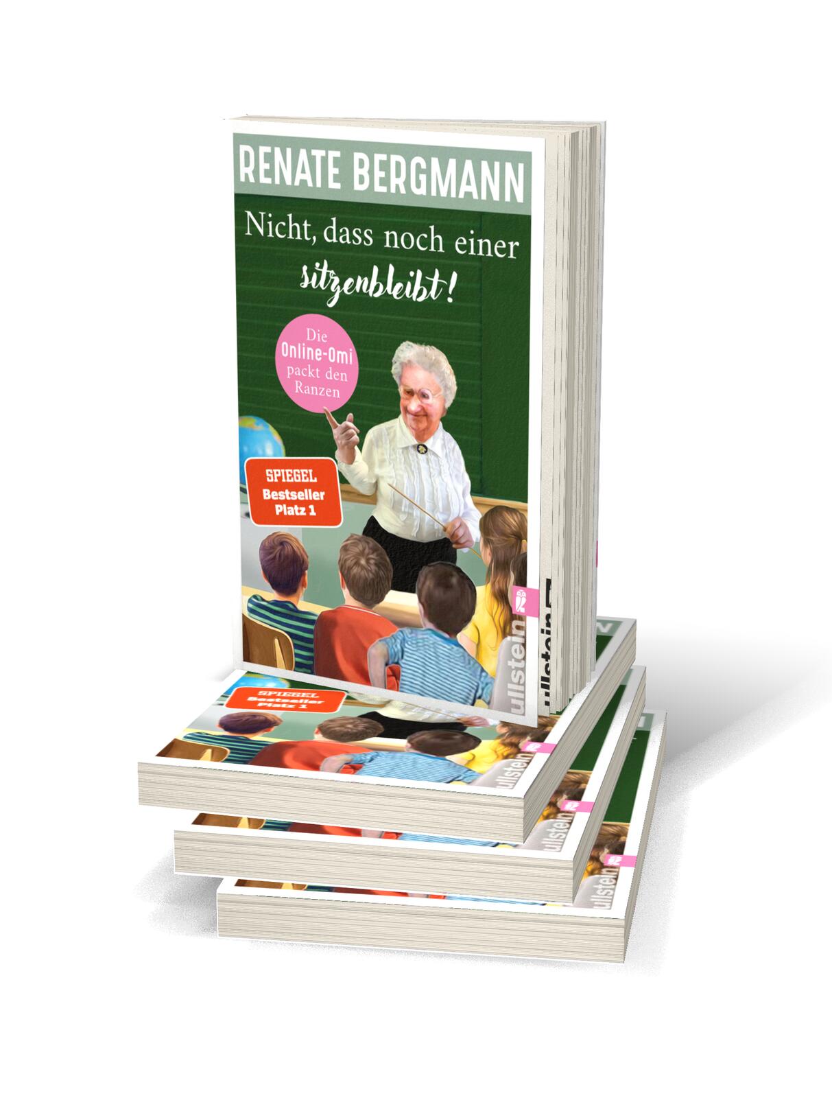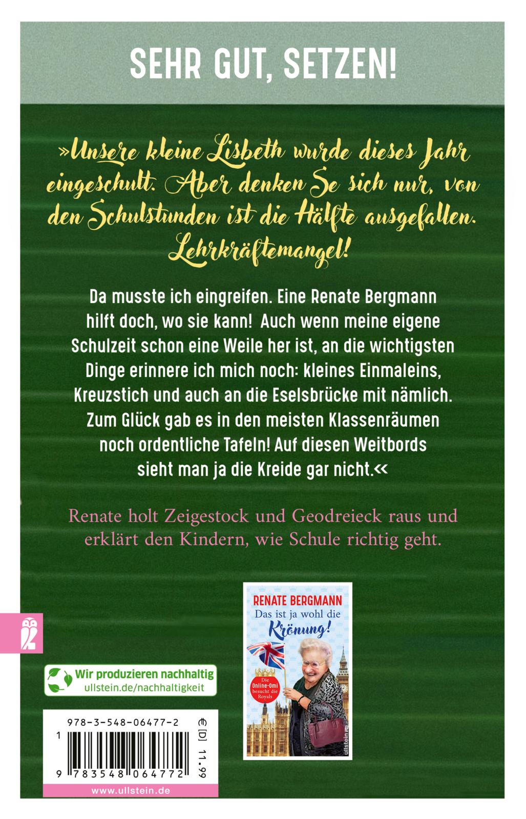 »Unsere kleine Lisbeth, was die Tochter von meinem Neffen Stefan ist, wurde dieses Jahr eingeschult. Aber denken Se sich nur, von den Schulstunden ist die Hälfte ausgefallen. Lehrkräftemangel! Ariane war ganz außer sich vor Sorge, dass das Kind auf der Strecke bleibt. Dabei ist die Kleine wirklich schlauer als zum Beispiel der Jemie-Dieter von meiner Nachbarin Frau Berber. Der hat sogar schon einen blauen Brief bekommen, aber das liegt daran, dass die Berber mit ihm die Hausaufgaben macht - und die ist nicht gerade die hellste Lampe im Laden. Na, jedenfalls musste man da eingreifen. Die reden von sozialem Pflichtjahr - aber warum eigentlich nur für die Jungen? Und die Rente soll es jetzt sogar erst mit 70 geben, denken Se das mal! Ich bin schon mit 60 in Pension gegangen! Da ist es besser, wenn ich noch was nacharbeite, bevor die mir draufkommen. Eine Renate Bergmann hilft doch, wo sie kann! Auch wenn meine eigene Schulzeit schon eine Weile her ist, an die wichtigsten Dinge erinnere ich mich noch: kleines Einmaleins, Kreuzstich und auch an die Eselsbrücke mit nämlich. Zum Glück gab es in den meisten Klassenräumen noch ordentliche Tafeln! Auf diesen Weitbords sieht man ja die Kreide gar nicht.«