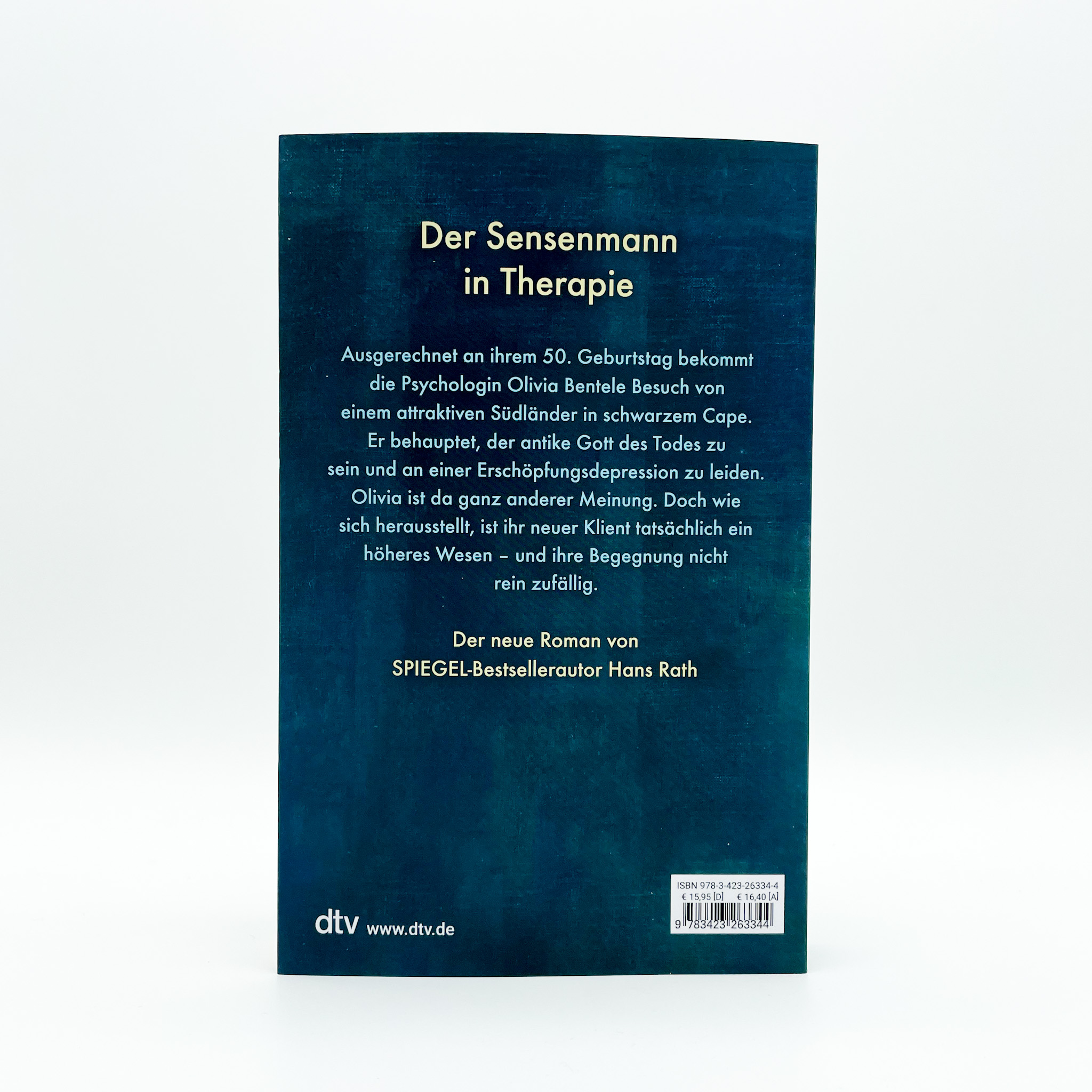 Ausgerechnet an ihrem 50. Geburtstag bekommt die Psychologin Liv Bentele Besuch von einem attraktiven Südländer in schwarzem Cape. Leider hat sich der Mann nur in der Tür geirrt. Aber dann ist plötzlich die alte Dame tot, nach der er sich erkundigt hat, und Liv stellt ihn zur Rede. In Wahrheit sei er Thanatos, der griechische Gott des sanften Todes, antwortet er freundlich, und ja, es deprimiere ihn zutiefst, wie unwürdig das Sterben heute sei. Liv sieht in ihm eher einen von Todessehnsucht geplagten Neurotiker und bietet ihm therapeutische Hilfe an. Bei ihrem lebhaften Austausch stellt sich heraus, dass Livs neuer Klient tatsächlich der Sensenmann ist - und sich nicht in der Tür geirrt hat.