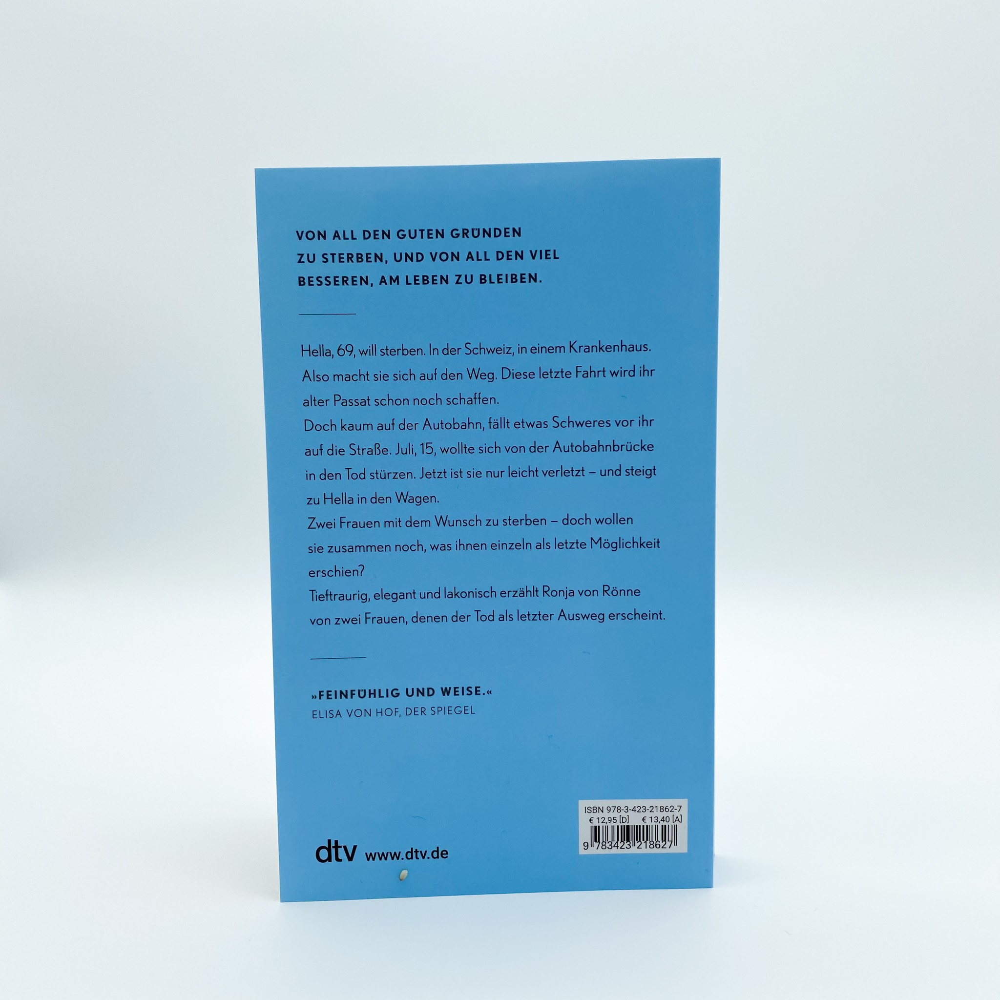 Hella, 69, will sterben. In der Schweiz, in einem Krankenhaus. Also macht sie sich auf den Weg. Diese letzte Fahrt wird ihr alter Passat schon noch schaffen. Doch kaum auf der Autobahn, fällt etwas Schweres vor ihr auf die Straße. Juli, 15, wollte sich von der Autobahnbrücke in den Tod stürzen. Jetzt ist sie nur leicht verletzt - und steigt zu Hella in den Wagen. Tieftraurig, elegant und lakonisch erzählt Ronja von Rönne von zwei Frauen, denen der Tod als bester Ausweg erscheint und die entscheiden müssen, ob sie zusammen noch wollen, was ihnen einzeln als letzte Möglichkeit erschien.
