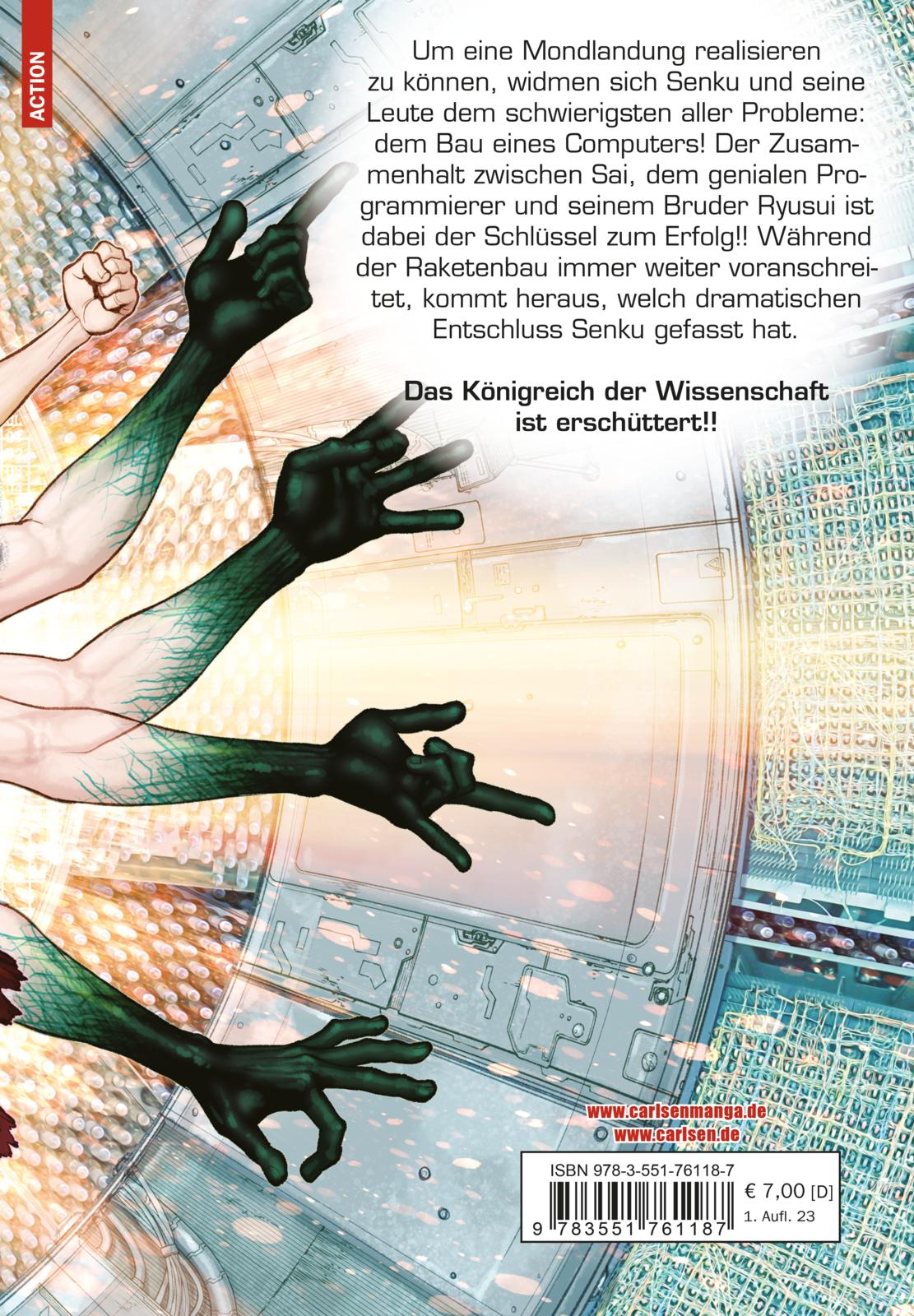 Um eine Mondlandung realisieren zu können, widmen sich Senku und seine Leute dem schwierigsten aller Probleme: dem Bau eines Computers! Der Zusammenhalt zwischen Sai, dem genialen Programmierer und seinem Bruder Ryusui ist dabei der Schlüssel zum Erfolg!! Während der Raketenbau immer weiter voranschreitet, kommt heraus, welch dramatischen Entschluss Senku gefasst hat.