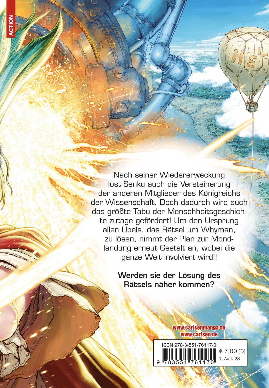 Nach seiner Wiedererweckung löst Senku auch die Versteinerung der anderen Mitglieder des Königreichs der Wissenschaft. Doch dadurch wird auch das größte Tabu der Menschheitsgeschichte zutage gefördert! Um den Ursprung allen Übels, das Rätsel um Whyman, zu lösen, nimmt der Plan zur Mondlandung erneut Gestalt an, wobei die ganze Welt involviert wird!!