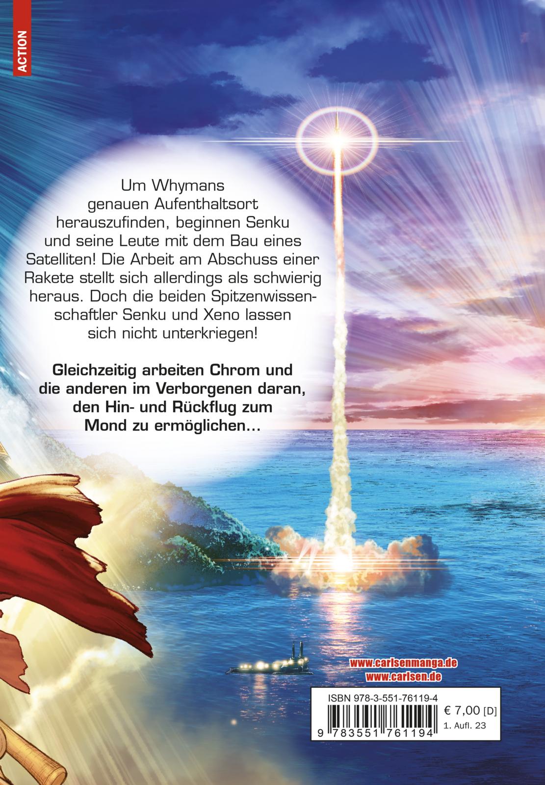 Um Whymans genauen Aufenthaltsort herauszufinden, beginnen Senku und seine Leute mit dem Bau eines Satelliten! Die Arbeit am Abschuss einer Rakete stellt sich allerdings als schwierig heraus. Doch die beiden Spitzenwissenschaftler Senku und Xeno lassen sich nicht unterkriegen! Gleichzeitig arbeiten Chrom und Suika im Verborgenen daran, den Hin- und Rückflug zum Mond zu ermöglichen...!!