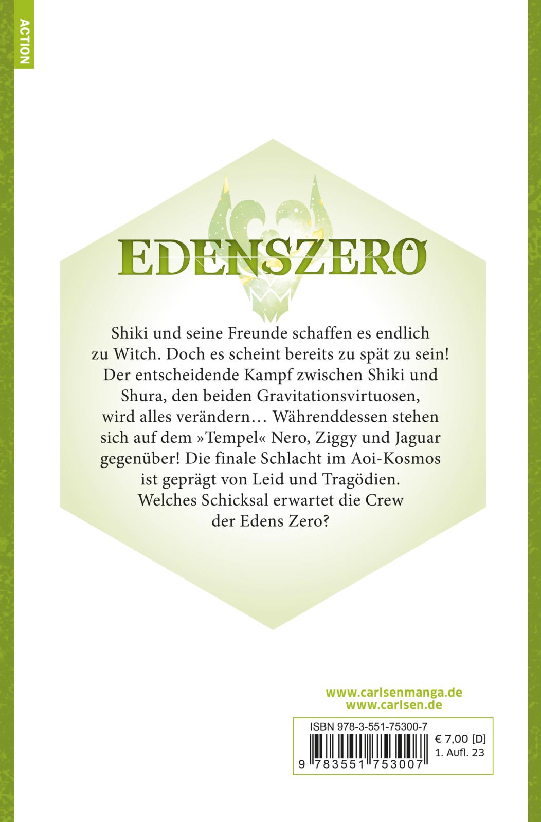 Shiki und seine Freunde schaffen es endlich zu Witch. Doch es scheint bereits zu spät zu sein! Der entscheidende Kampf zwischen den beiden Gravitationsvirtuosen wird alles verändern. Währenddessen stehen sich auf dem »Tempel« Nero, Ziggy und Jaguar gegenüber! Die finale Schlacht im Aoi-Kosmos ist geprägt von Leid und Tragödien. Welches Schicksal erwartet die Crew der Edens Zero?