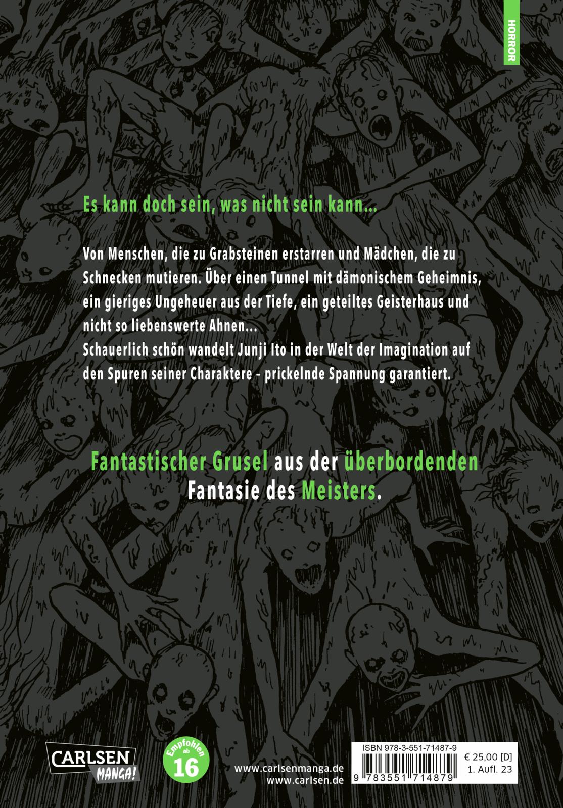 Von Menschen, die zu Grabsteinen erstarren und Mädchen, die zu Schnecken mutieren. Über einen Tunnel mit dämonischem Geheimnis, lebendig scheinende Statuen und nicht so liebenswerte Ahnen... In elf Kurzgeschichten fächert Junji Ito eine Horrorbandbreite auf, die das Herz eines jeden Gruselfans höher schlagen lässt. Schauerlich-schöne und knisternde Unterhaltung garantiert!