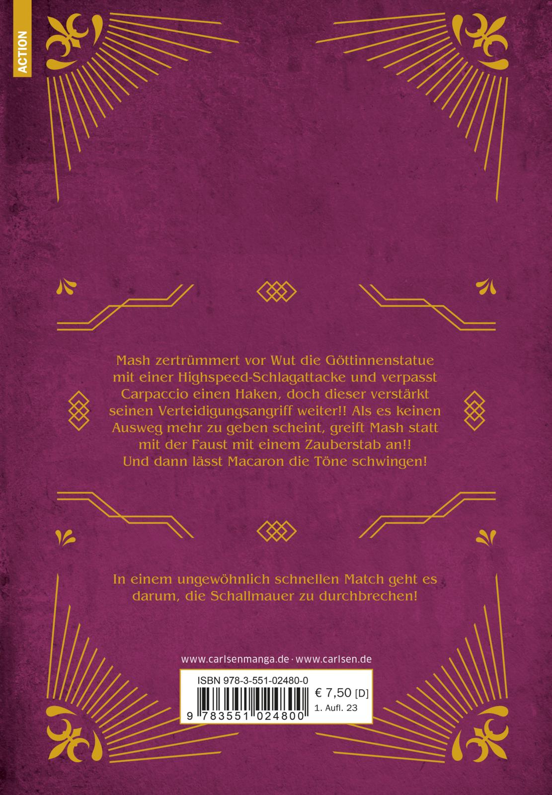 Mash zertrümmert vor Wut die Göttinnenstatue mit einer Highspeed-Schlagattacke und verpasst Carpaccio einen Haken, doch dieser verstärkt seinen Verteidigungsangriff weiter!! Als es keinen Ausweg mehr zu geben scheint, greift Mash statt mit der Faust mit einem Zauberstab an!! Und dann lässt Macaron die Töne schwingen! In einem ungewöhnlich schnellen Match geht es darum, die Schallmauer zu durchbrechen!