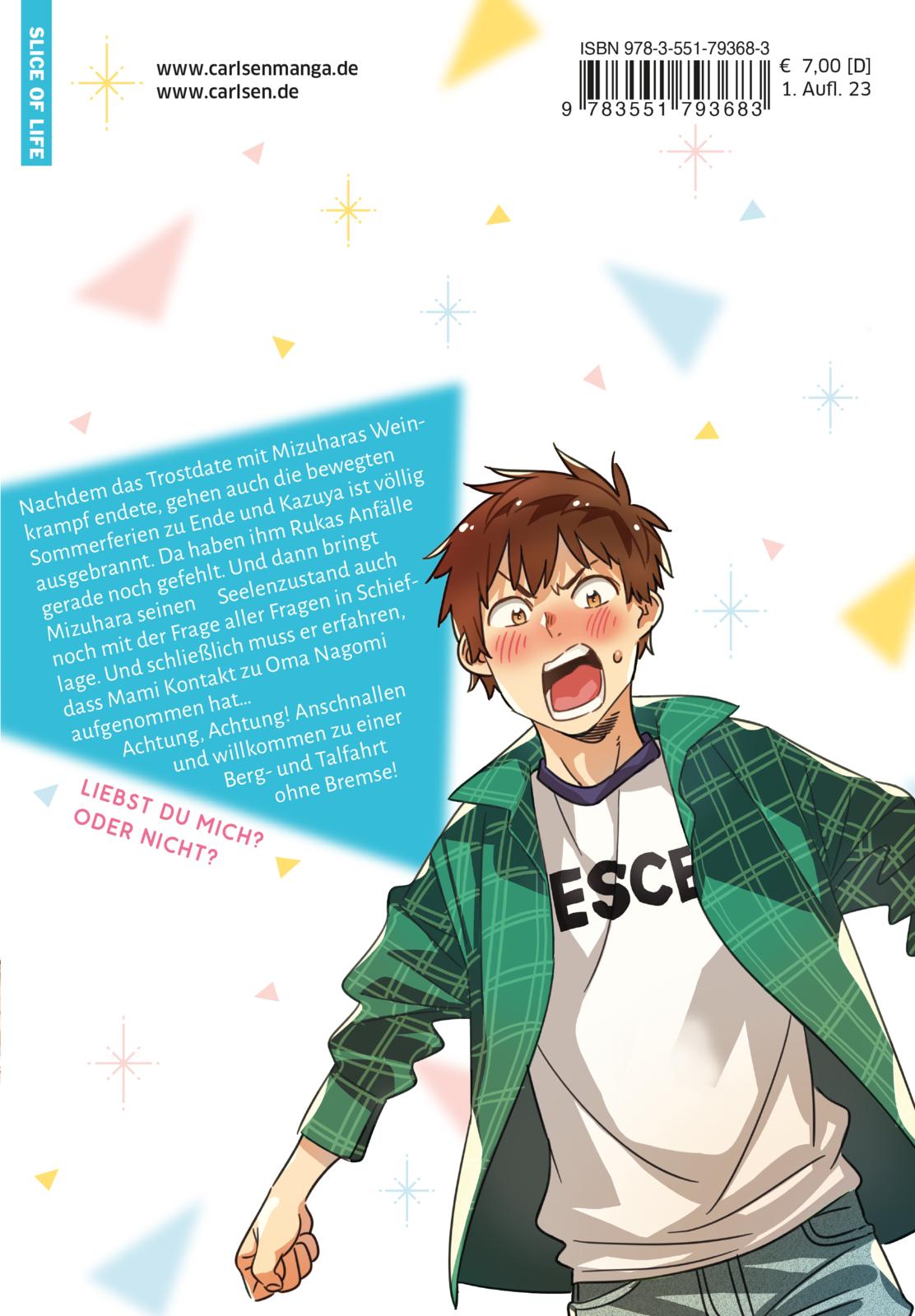 Nachdem das Trostdate mit Mizuharas Weinkrampf endete, gehen auch die bewegten Sommerferien zu Ende und Kazuya ist völlig ausgebrannt. Da haben ihm Rukas Anfälle gerade noch gefehlt. Und dann bringt Mizuhara seinen Seelenzustand auch noch mit der Frage aller Fragen in Schieflage. Und schließlich muss er erfahren, dass Mami Kontakt zu Oma Nagomi aufgenommen hat...