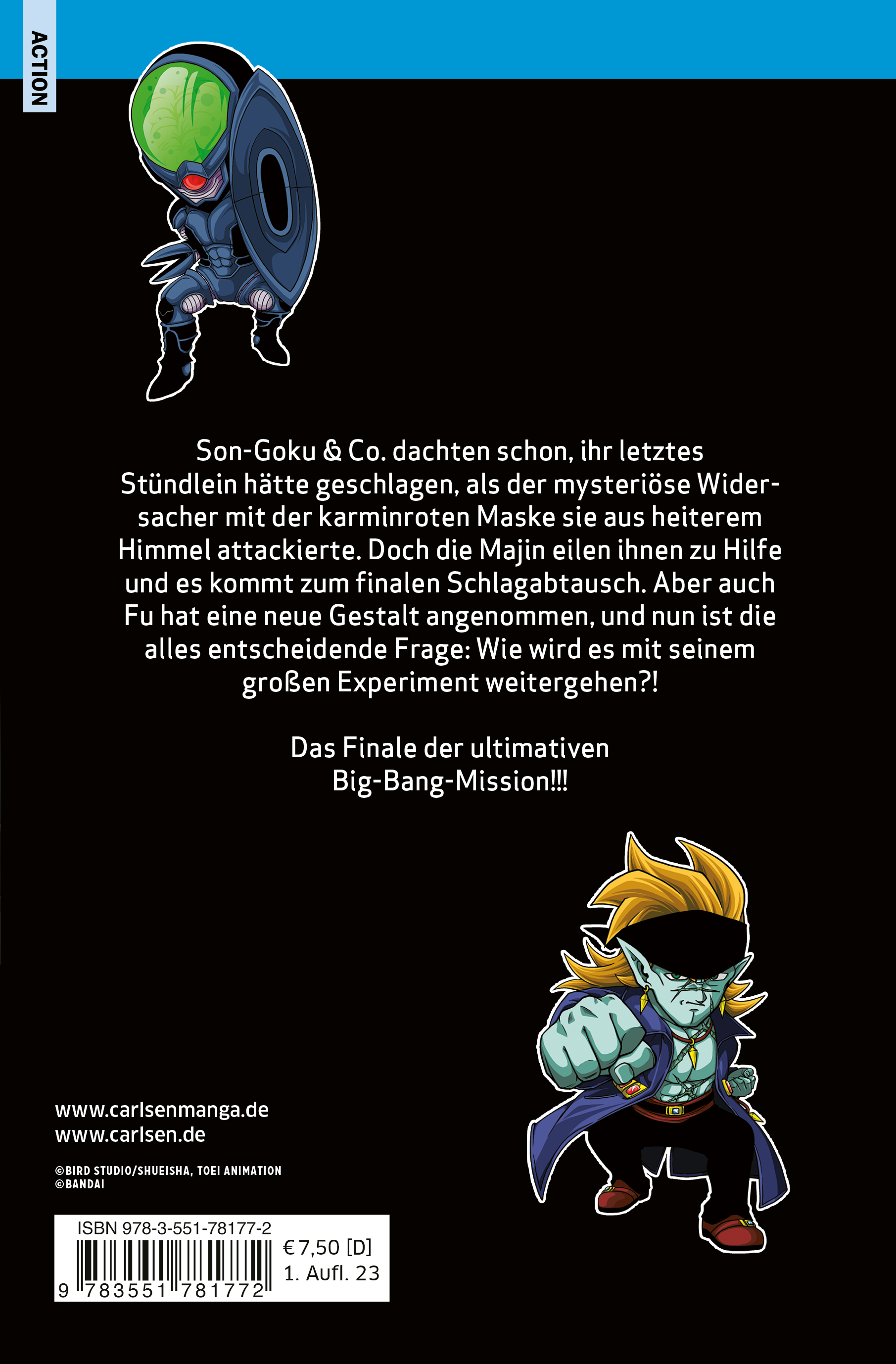 Der dunkle Dämonenkönig Fu ist erwacht. Und seine perfiden Experimente gehen weiter: Er will ein neues Universum erschaffen, die »Big Bang Mission«! Goku und Vegeta unternehmen alles, um diese kosmische Katastrophe noch zu verhindern, doch es wird ein unerbittlicher Kampf. Die Mächte, mit denen sie es zu tun haben, sind nicht von dieser Welt! Wer wird noch auf der Bildfläche erscheinen? Gegen welche Gegner müssen sie diesmal antreten?