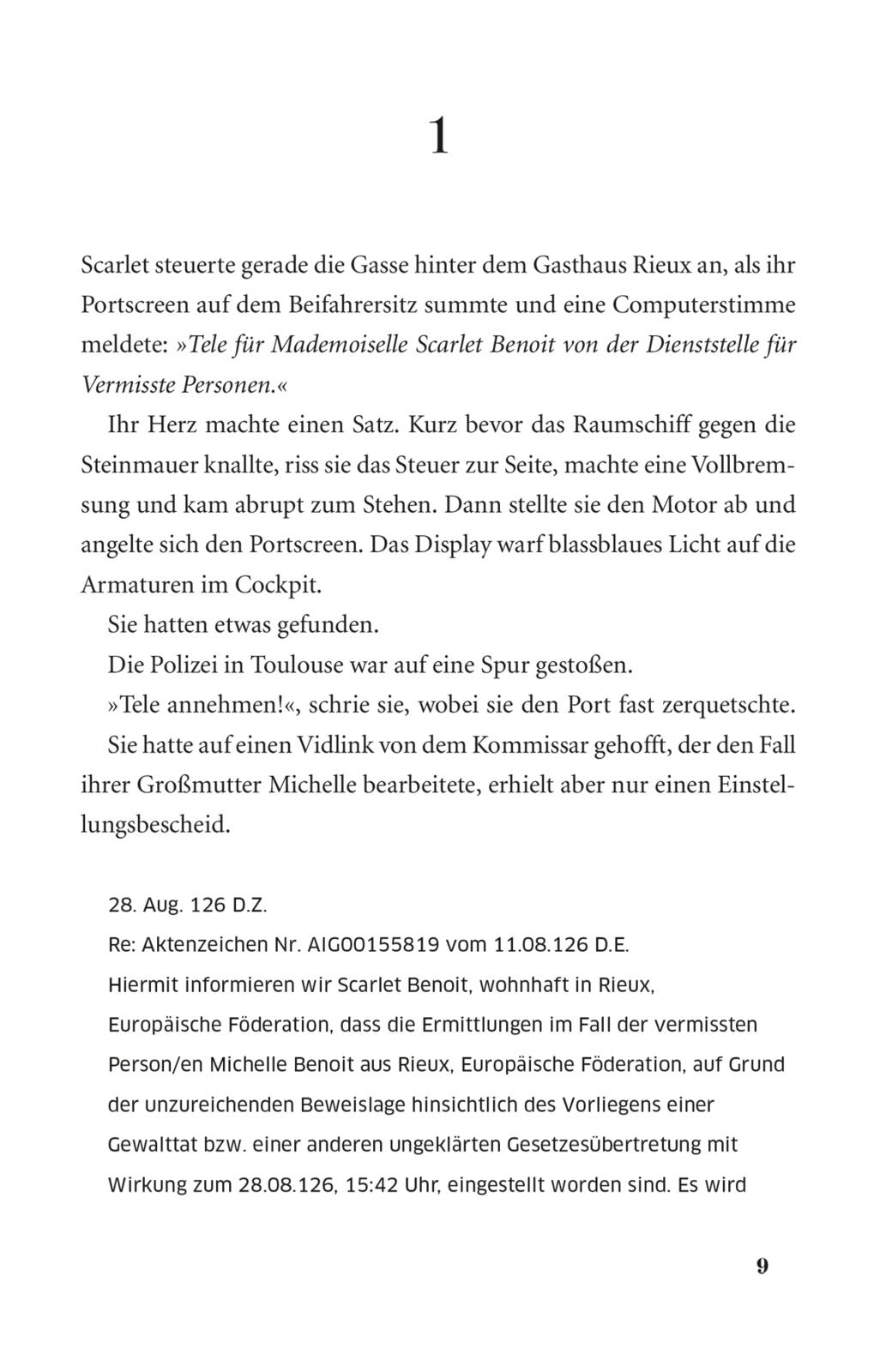 Zwei ganze Wochen ist Scarlets Großmutter nun schon verschwunden. Entführt? Tot? Die Leute im Dorf sagen, sie sei sicher abgehauen. Sie sei ja sowieso verrückt. Aber für Scarlet ist Grandmère alles - von ihr hat sie gelernt, wie man ein Raumschiff fliegt, Bio-Tomaten anbaut und seinen Willen durchsetzt. Dann trifft Scarlet einen mysteriösen Straßenkämpfer - Wolf. Er fasziniert sie; doch kann sie ihm trauen? Immerhin: Die reißerischen Berichte über Cinder und das Attentat auf Prinz Kai hält Wolf ebenso wie sie für Quatsch. Aber irgendein Geheimnis verbirgt der Fremde ...