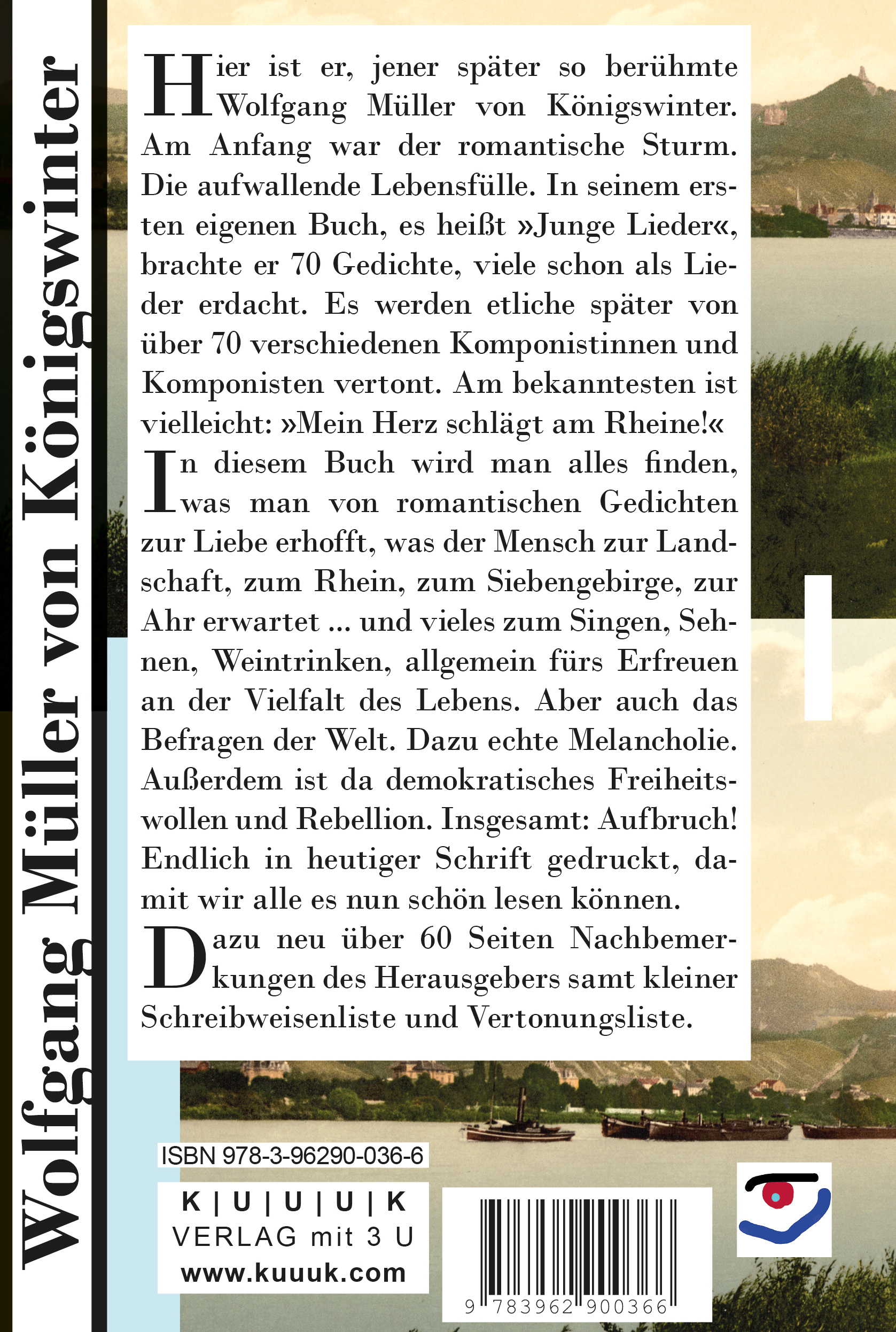 Wolfgang Müller wurde am 5. März 1816 in Königswinter geboren. Dieser Heimatstadt und der gesamten Heimatregion hielt er in Gedanken und real durch etliche Ausflüge und Besuche immer die Treue. Müller wohnte (nach den ersten allerjüngsten Kinderjahren in Königswinter) in Bergheim bei Köln, später, bereits als Gymnasialschüler, in Düsseldorf und schrieb nun schon. Für das Medizinstudium kam Wolfgang vier Jahre lang nach Bonn, beendete alles in Berlin, danach zog er als fertiger, bald auch praktizierender Arzt (und zugleich werdender Schriftsteller) wieder für 13 Jahre nach Düsseldorf. Dort wurde 1841 endlich das Buch „Junge Lieder“ publiziert. Ab 1853 waren die letzten 20 Lebensjahre für den Wohnsitz Köln bestimmt. Das Rheinland im weitesten Sinne blieb immer sein, auch gedankliches, Zuhause. Dazu gehörte für ihn auch die Ahrregion, man hatte als Familie über die Familie der Mutter immer eine enge Verbindung nach Bodendorf ... und (heute Bad) Neuenahr. Eben dort ist Müller mit nur 57 Jahren verstorben. Er schrieb eine Unmenge von Büchern mit Gedichten, Sagen, Erzählungen. Er schuf Beiträge, Nekrologe, ALndschaftsbeschreibungen, Historisches, Artikel, Biographien, Dramen, Lustspiele, Märchenbücher, vielfältige Texte, gerne auch über ein Kerninteresse: die Kunst. Die Publikationsliste ist sehr lang. Die Zahl der von ihm geschaffenen Veröffentlichungen dürfte in die Hunderte gehen. Das Buch »Junge Lieder« (1841) steht symbolisch wie ein Beginn von allem. Wir sollten den jungen, aber auch den reifen Wolfgang Müller kennen und schätzen.