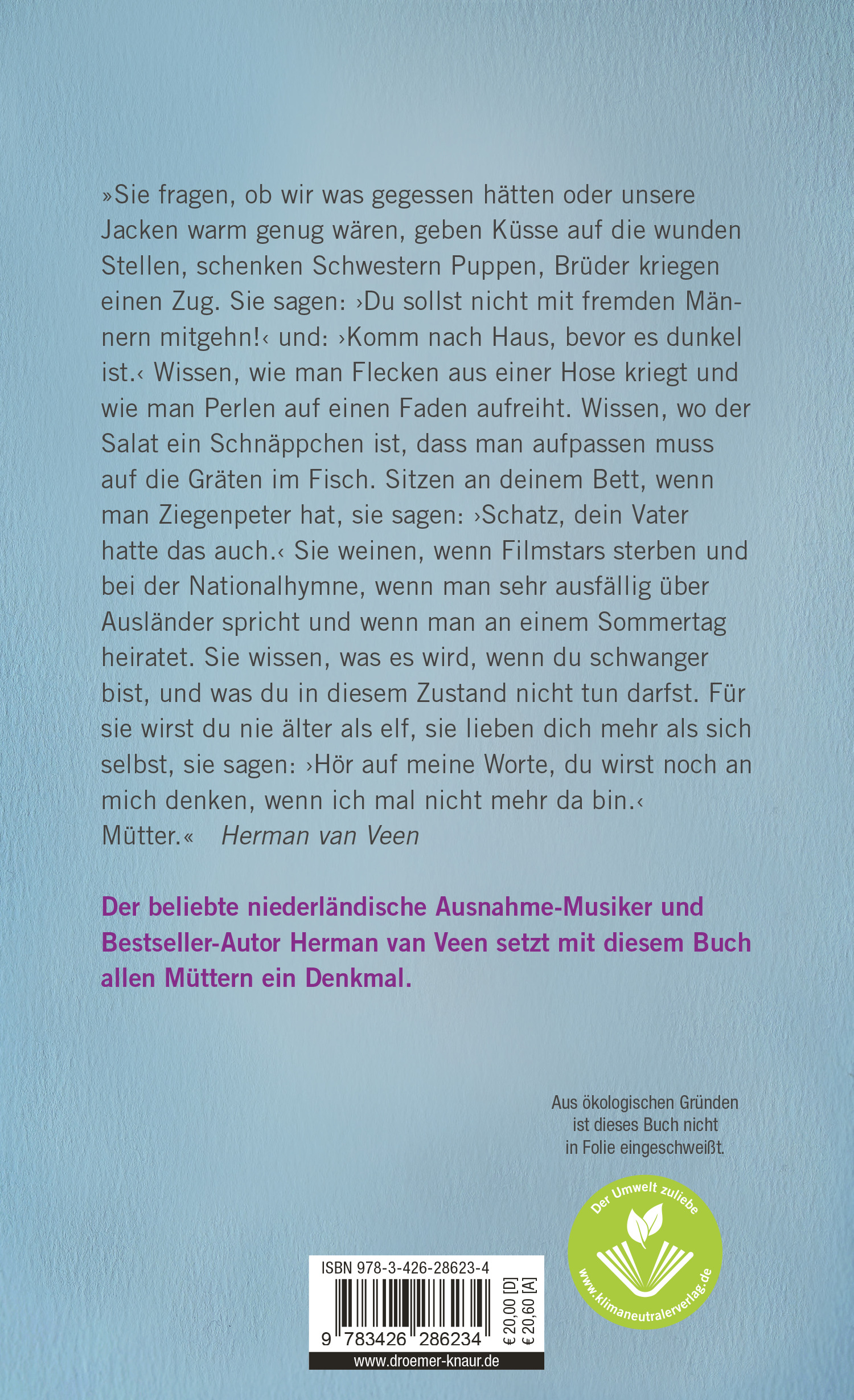 "Sie fragen, ob wir schon gegessen haben, ob unsere Jacken warm genug sind, küssen uns auf wunde Stellen. Sie wissen, wie man Flecken aus einer Hose bekommt, und wie man Perlen auf einen Faden aufreiht. Sie wissen, wo der Salat ein Schnäppchen ist und wo nicht. Sie sitzen an deinem Bett, wenn du Mumps hast und sagen: 'Schatz, dein Papa hatte das auch.' Für sie wirst du nie älter als ungefähr elf, sie lieben dich mehr als sich selbst. Sagen: 'Hör auf meine Worte, du wirst noch an mich denken, wenn ich nicht mehr da bin.' Mütter." Herman van Veen