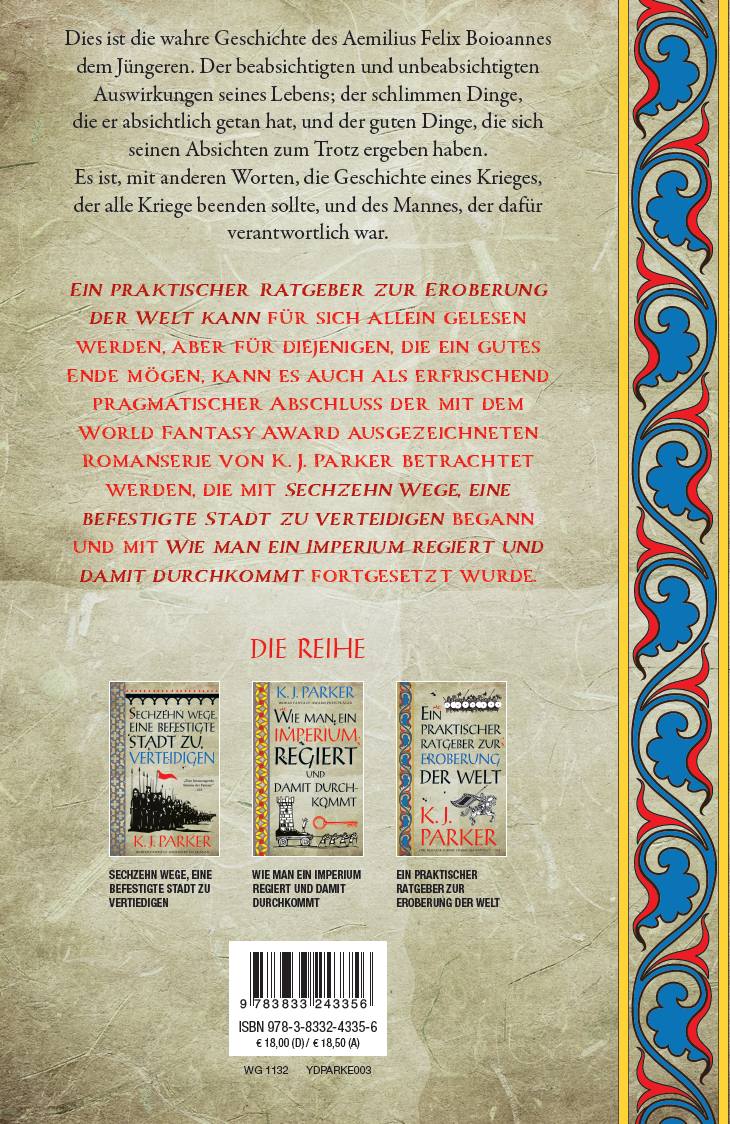 Dies ist die wahre Geschichte des Aemilius Felix Boioannes dem Jüngeren. Der beabsichtigten und unbeabsichtigten Auswirkungen seines Lebens; der schlimmen Dinge, die er absichtlich getan hat, und der guten Dinge, die sich seinen Absichten zum Trotz ergeben haben. Es ist, mit anderen Worten, die Geschichte eines Krieges, der alle Kriege beenden sollte, und des Mannes, der dafür verantwortlich war. Ein praktischer Ratgeber zur Eroberung der Welt kann für sich allein gelesen werden, aber für diejenigen, die ein gutes Ende mögen, kann es auch als erfrischend pragmatischer Abschluss der mit dem World Fantasy Award ausgezeichneten Romanserie von K. J. Parker betrachtet werden, die mit Sechzehn Wege, eine befestigte Stadt zu verteidigen begann und mit Wie man ein Imperium regiert und damit durchkommt fortgesetzt wurde.Band 3 der Reihe "Die Belagerung"Überblick über die Reihe "Die Belagerung"Band 1: Sechzehn Wege, eine befestigte Stadt zu verteidigenBand 2: Wie man ein Imperium regiert und damit durchkommtBand 3: Ein praktischer Ratgeber zur Eroberung der Welt
