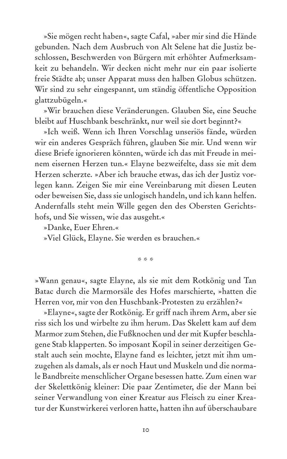 Elayne Kevarian gestattete sich den kleinsten Anflug von Stolz. Fünf Monate hatte es bis zu diesem Moment gedauert. Fünf Monate geduldiger Vermittlung zwischen dem Rotkönig, dem schrecklichen Fürsten, der Dresediel Lex aus den Händen der Götter gerissen hatte, und Tan Batac, dem Großgrundbesitzer von Huschbank. Fünf Monate, um neue Schutzzauber mittels Kunstwirkerei zu erschaffen, die nach ihrer eigenen, ehrlichen Einschätzung allen anderen, die sie je gesehen hatte, gleichwertig waren. Manche Kunstwirkenden geben sich damit zufrieden, die Welt widerzuspiegeln. Elayne hatte eine ganz neue gebaut. Sie unterzog ihre Schutzzauber denselben Tests wie die der Götter. Brände erstarben, Seuchen verflogen, Aufstände hielten sich in Grenzen, dämonische Horden zogen sich in die äußeren Höllen zurück. Und die Stadt – stand. »Unser Vorschlag wird Huschbank von schlechter Theologie und noch schlechterer Stadtplanung befreien. Wir werden diese Stadt besser machen.« Sie starrte hinauf in die Zwillingssonnen, die an einem Himmel hingen, der so tiefblau war wie Gemälde auf Porzellan. Sie wartete auf den Urteilsspruch. Die Zeit verrann, verging langsam. Die kristallenen Türme ihres Triumphes leuchteten. »Nein«, sagte die Richterin. Die Welt brach auf, und sie fielen.